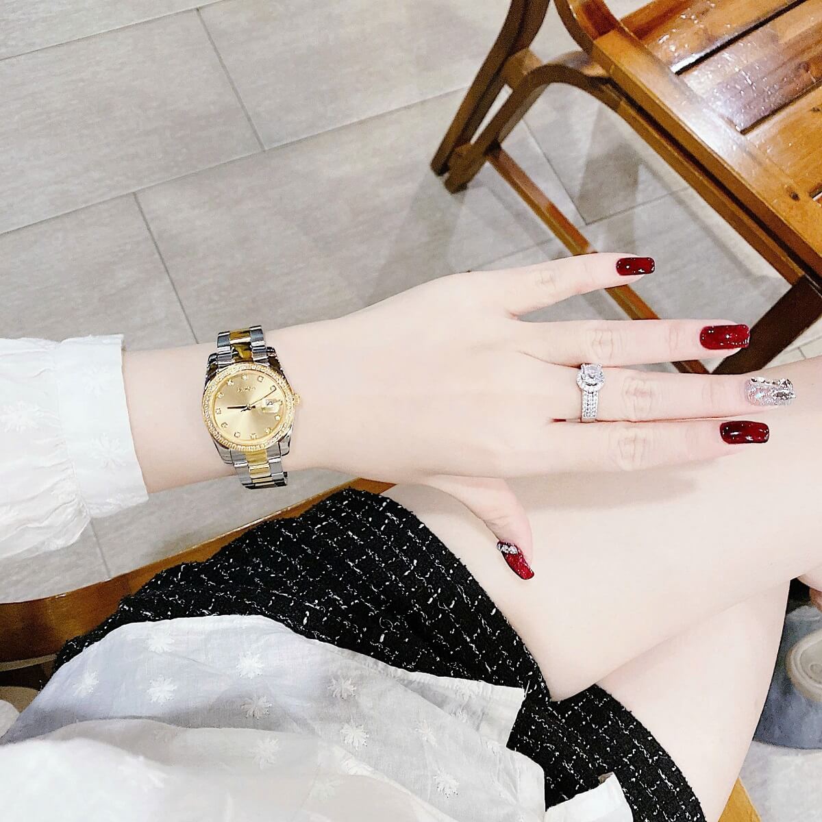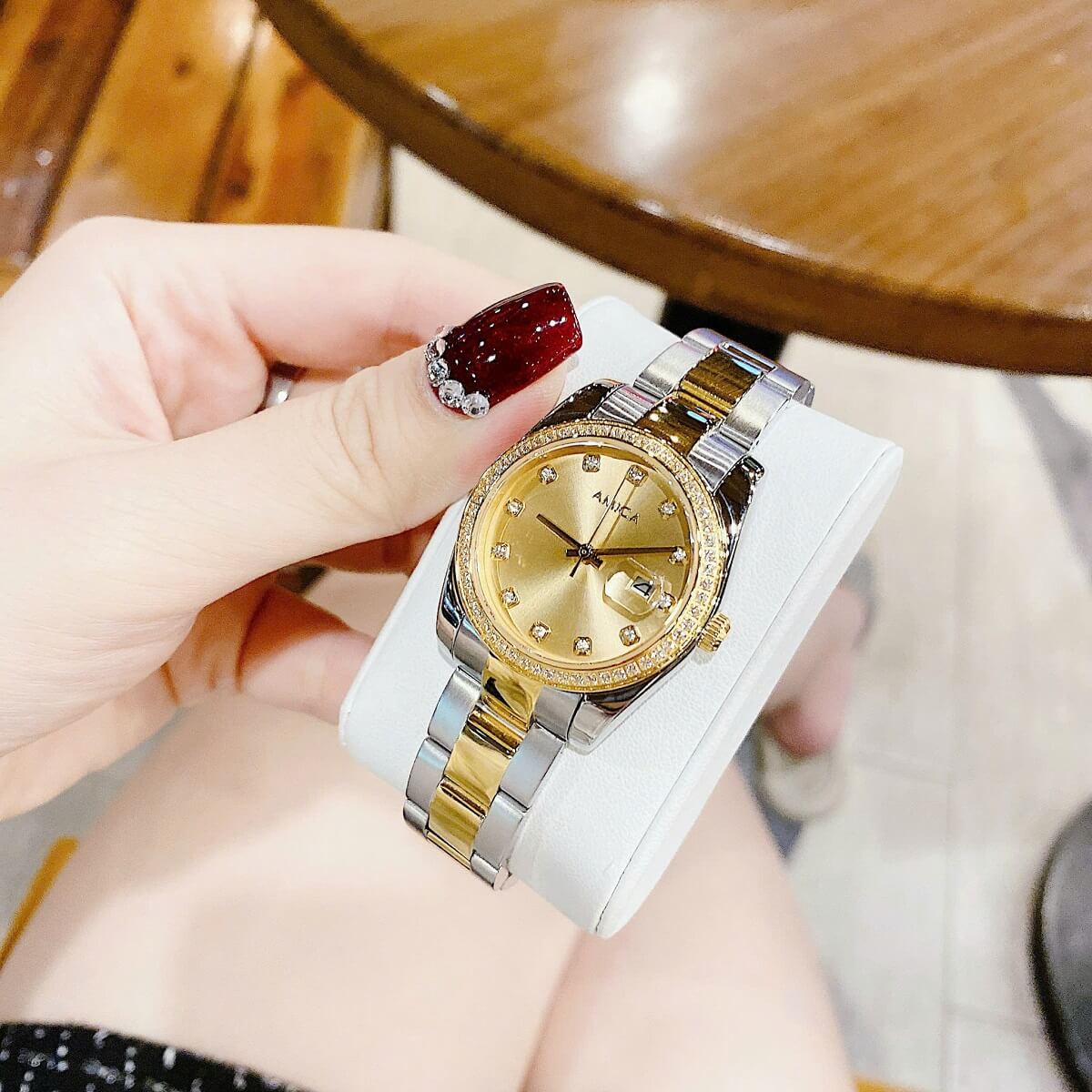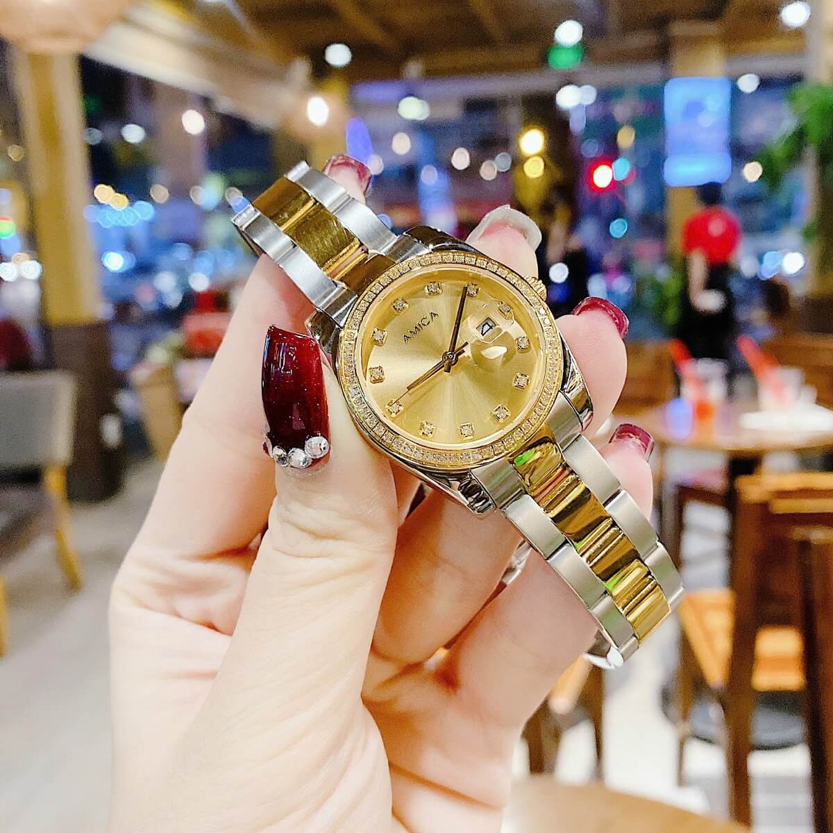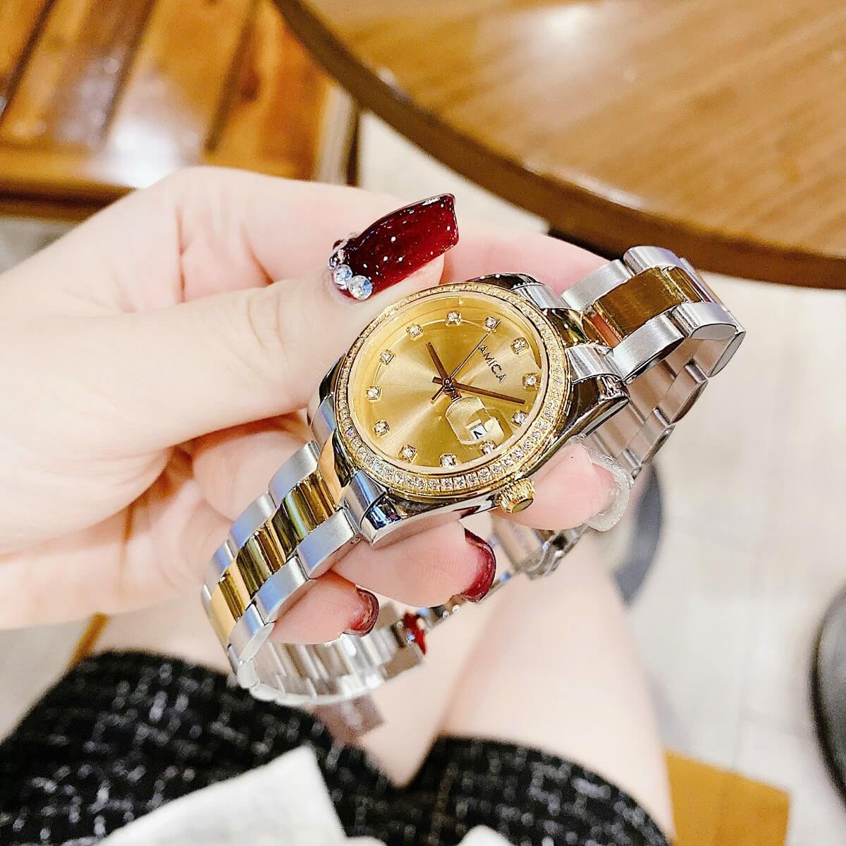 Đính đá: Mặt đồng hồ được đính những viên đá nhỏ xung quanh, làm tăng thêm vẻ lấp lánh và cuốn hút, tạo điểm nhấn nổi bật cho người đeo.