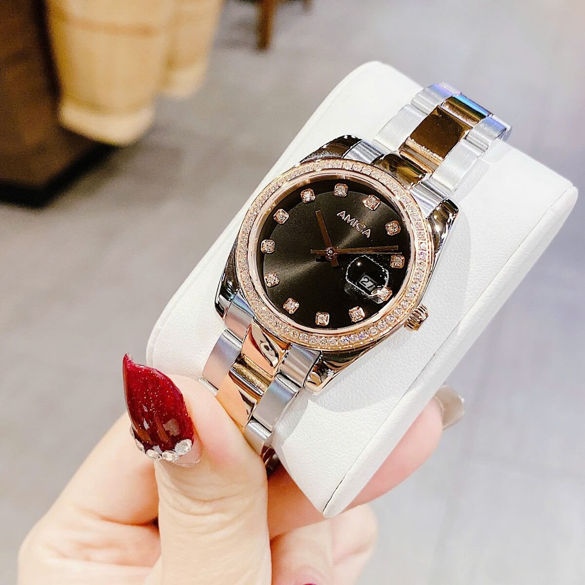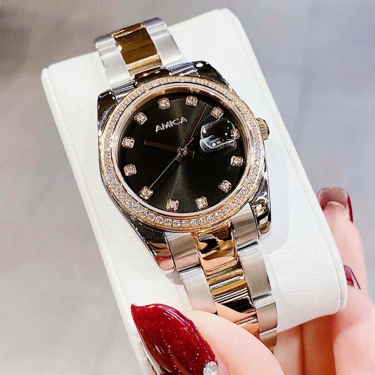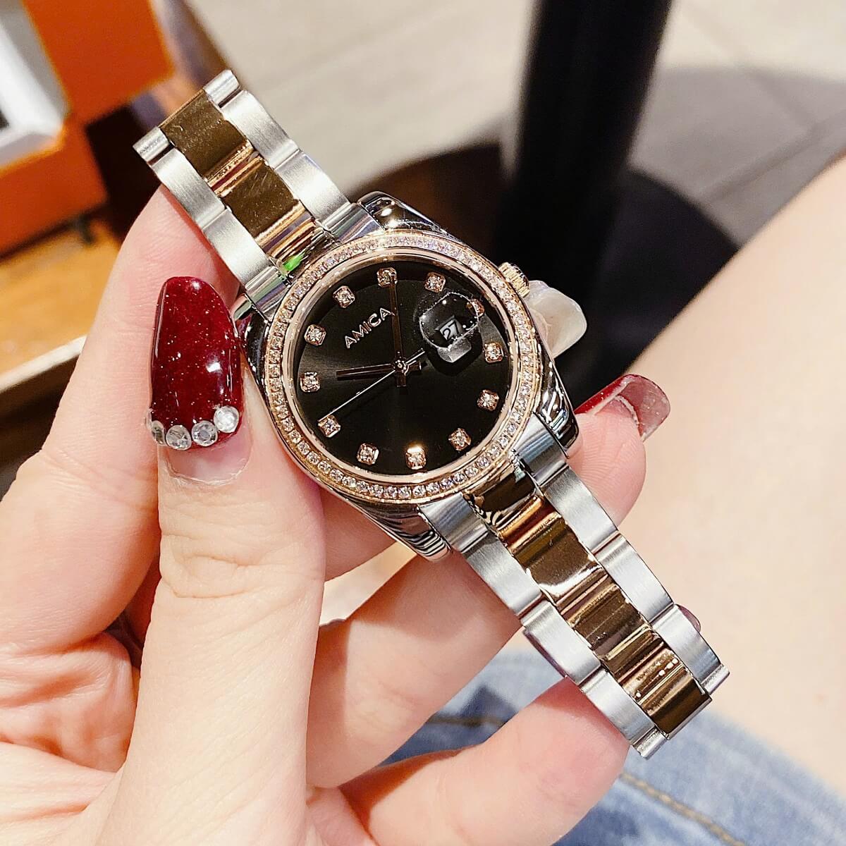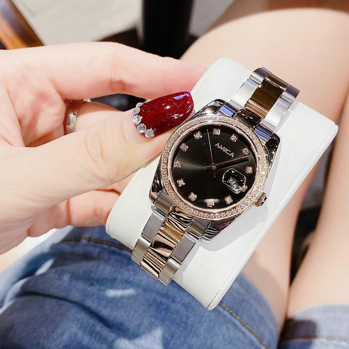 Thông tin chi tiết: Đồng Hồ Nữ Amica A058 Dây Vỏ Inox Demi Rose Mặt Đen Đính Đá 32mm Chính Hãng