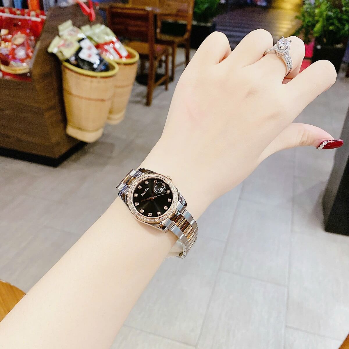 Mặt đồng hồ màu đen: Mặt đồng hồ màu đen tạo nên sự tương phản đẹp mắt với dây inox demi rose, làm nổi bật các chi tiết và đồng thời mang lại vẻ sang trọng, dễ nhìn.