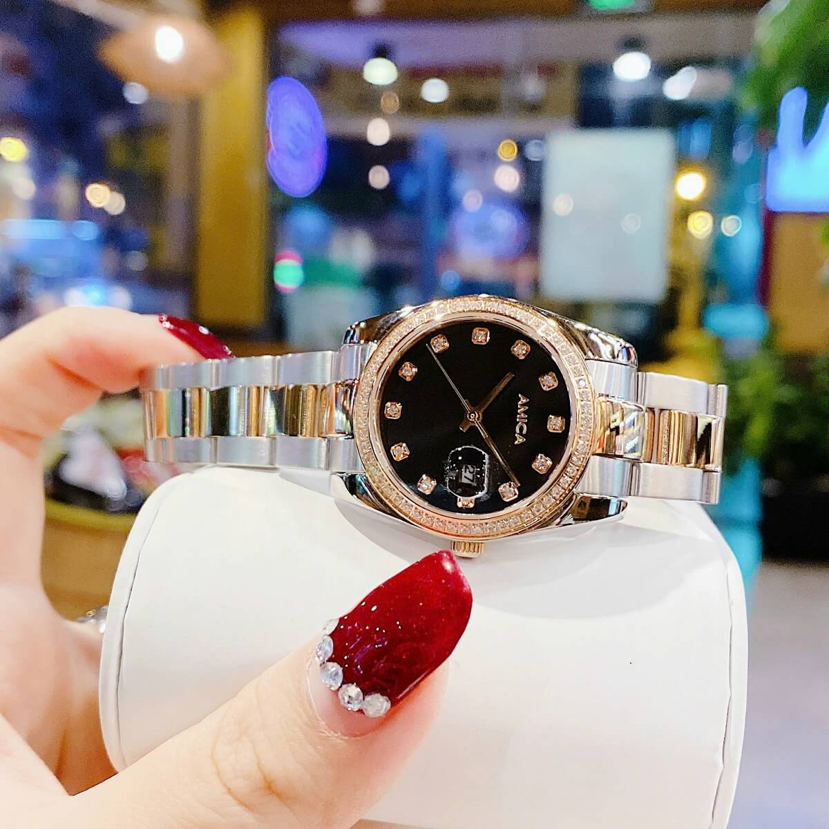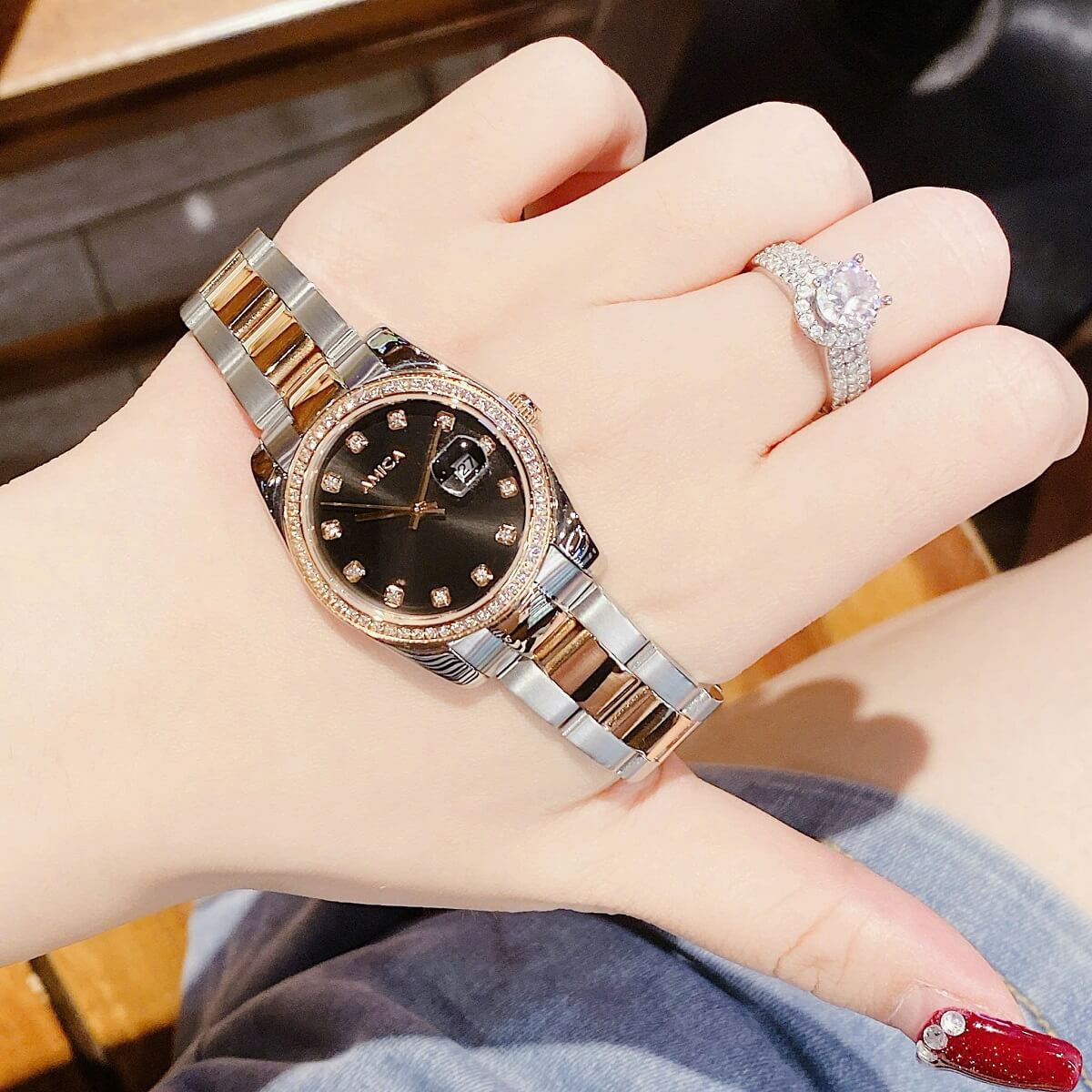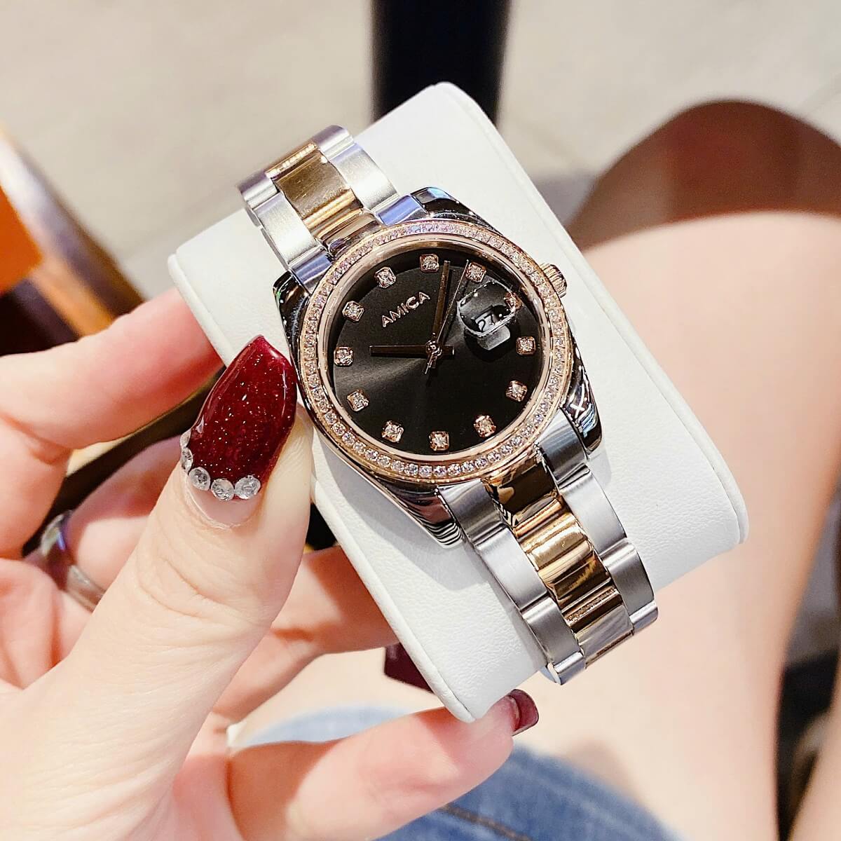 Đính đá: Những viên đá quý được đính trên mặt đồng hồ giúp tạo điểm nhấn lấp lánh, tăng thêm phần quý phái và thu hút ánh nhìn.