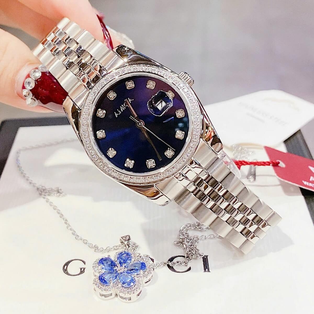Các chi tiết đính đá xung quanh mặt đồng hồ là một điểm cộng lớn cho thiết kế này. Những viên đá lấp lánh không chỉ làm tăng thêm phần sang trọng mà còn tạo nên sự quý phái, tinh tế cho người sở hữu. Mỗi viên đá được gia công tỉ mỉ, đảm bảo độ sáng và không bị mờ hay rơi rớt trong suốt quá trình sử dụng.