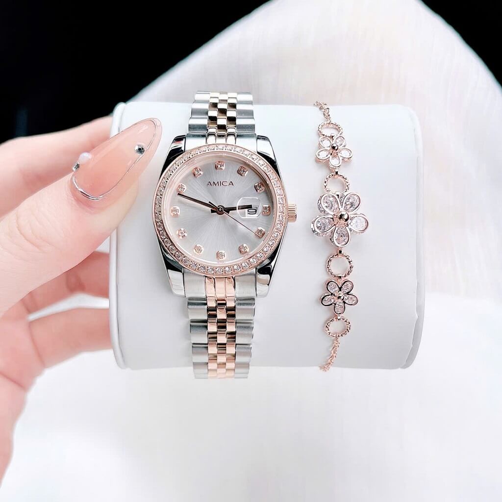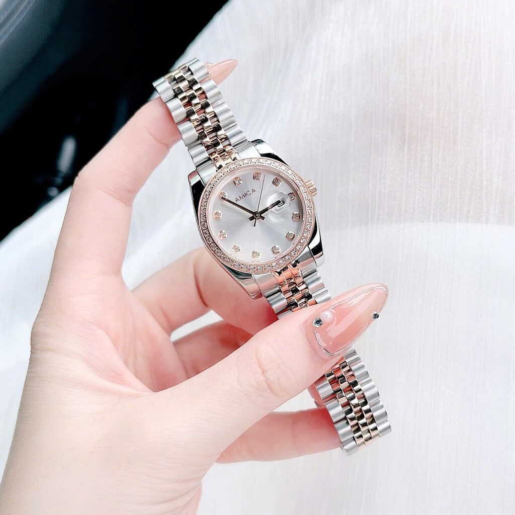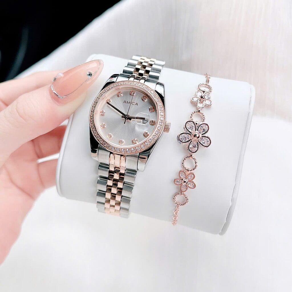 Đồng hồ nữ Amica A059 với thiết kế dây vỏ inox và kính sapphire là một sản phẩm thời trang và sang trọng, thích hợp cho những cô nàng yêu thích sự tinh tế và hiện đại. Dưới đây là một số đặc điểm nổi bật của sản phẩm: