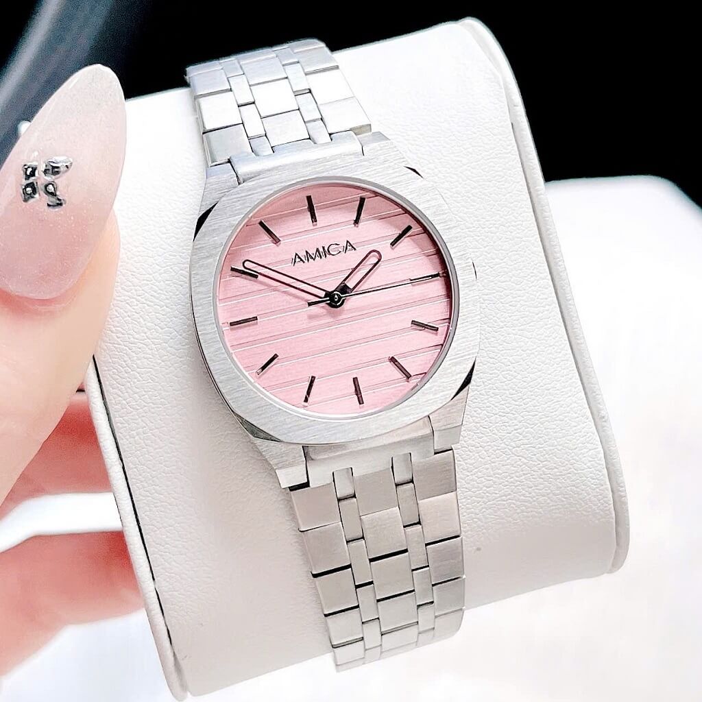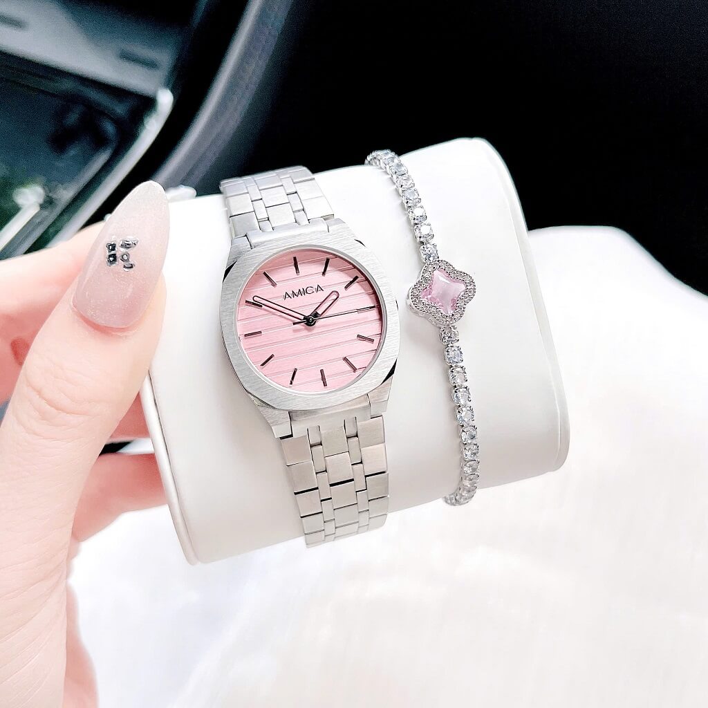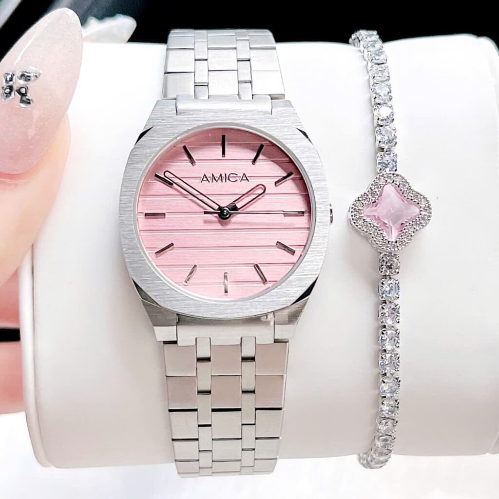 Mặt số hồng: Màu sắc nhẹ nhàng của mặt số mang lại cảm giác tươi mới và dễ chịu, phù hợp với nhiều phong cách trang phục khác nhau.