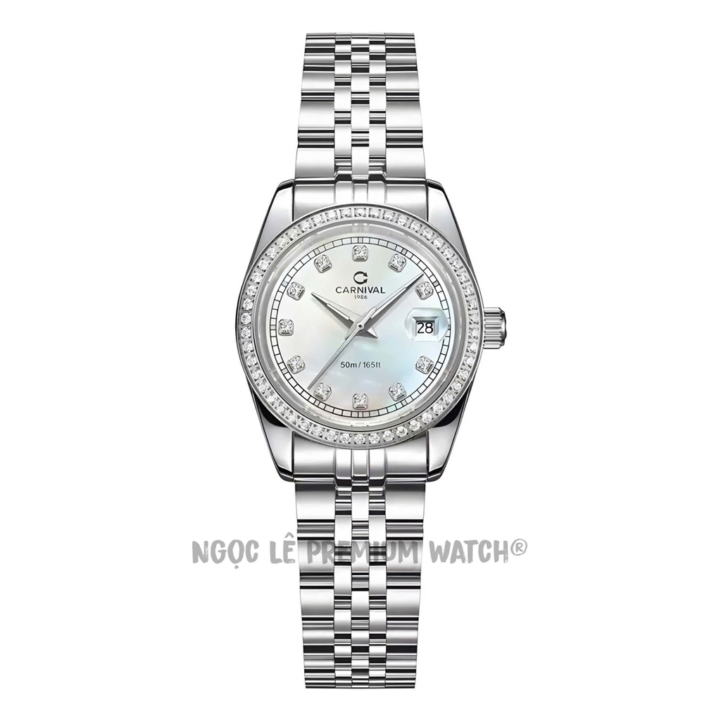 Đồng Hồ Nữ Carnival 8131L2 Dây Thép Silver Mặt Xà Cừ Trắng Viền Đá Size 30mm Quartz