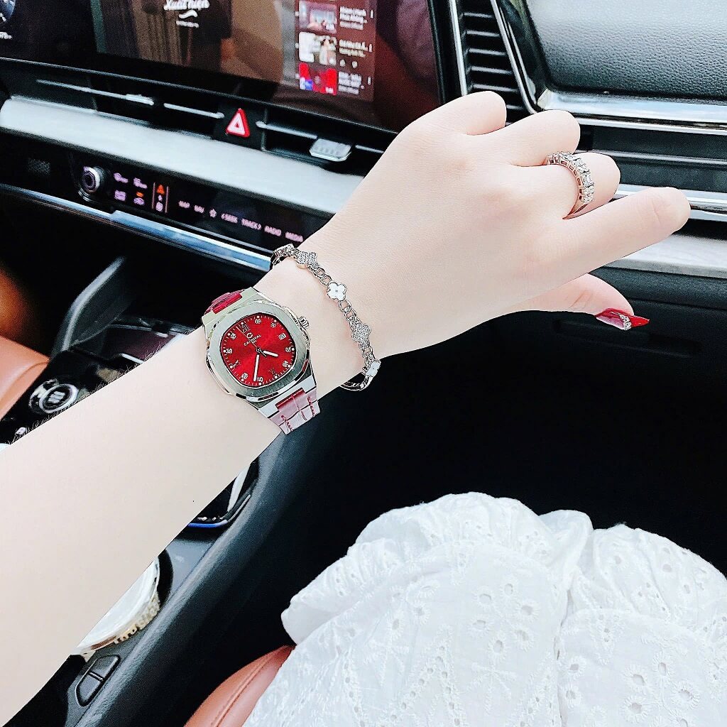 Tone đỏ chủ đạo – Mặt số và dây đồng bộ tạo nên vẻ ngoài đồng nhất, đầy sức hút.