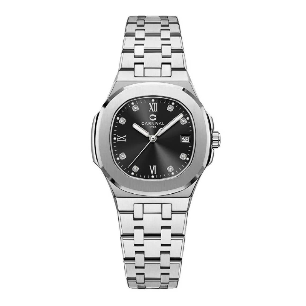 Đồng hồ nữ Carnival 8160L dây thép silver mặt đen size 34mm, kính sapphire chống trầy, máy pin Quartz Japan Movement, viền trơn thanh lịch, chống nước 3ATM, thiết kế sang trọng tại Ngọc Lê Watches.
