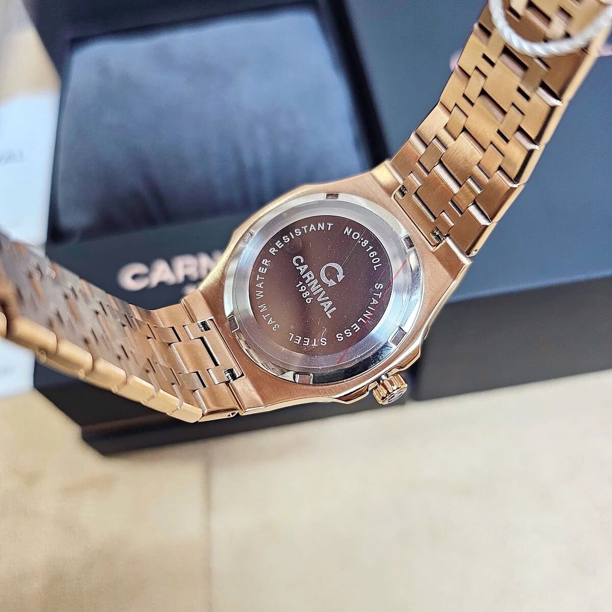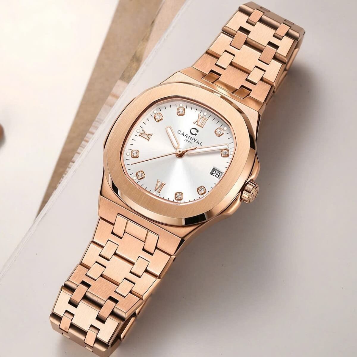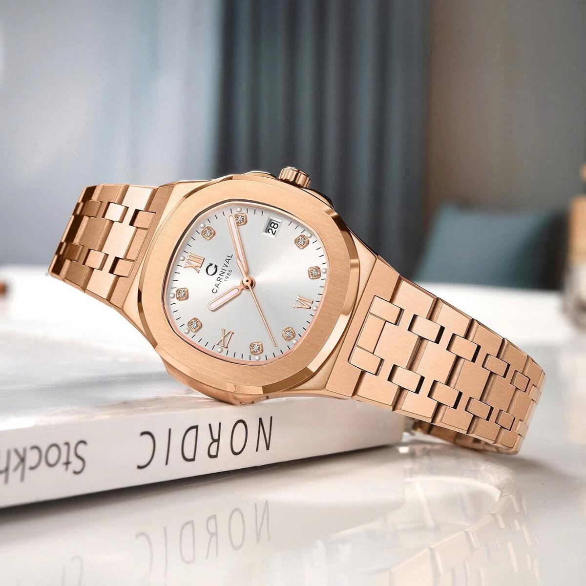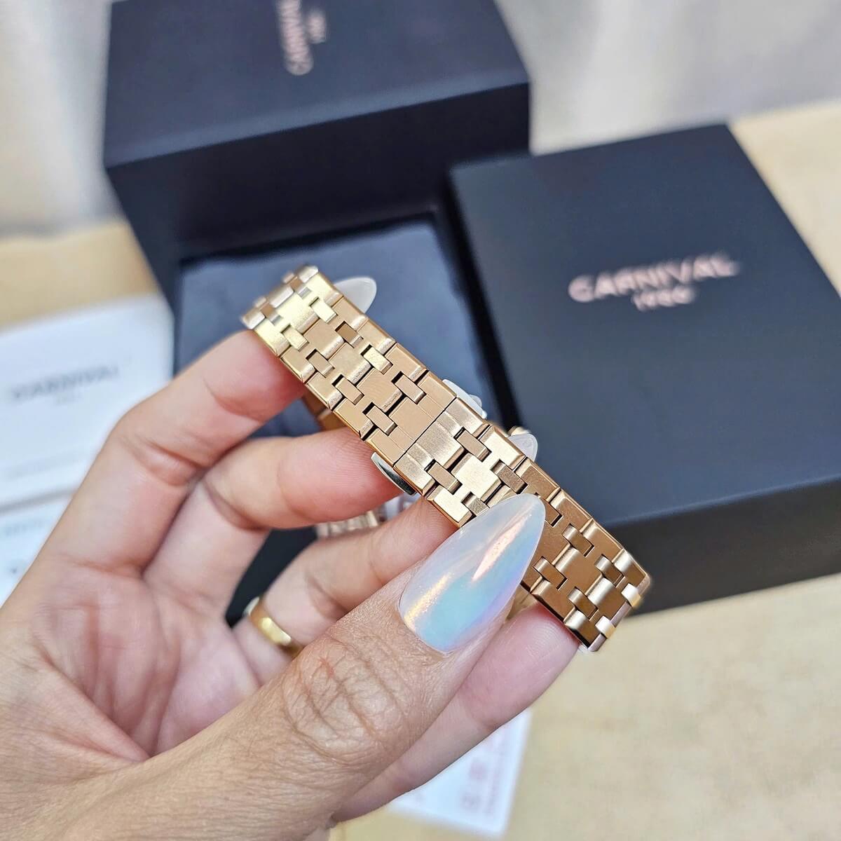 Dây đeo của đồng hồ Carnival 8160L được làm từ thép không gỉ cao cấp, với màu vàng hồng đồng điệu với vỏ đồng hồ. Dây đeo có thiết kế nhẹ nhàng, dễ chịu khi đeo và rất bền bỉ trong quá trình sử dụng. Đây là một điểm cộng lớn cho chiếc đồng hồ, vì thép không gỉ không chỉ tạo ra vẻ ngoài đẹp mắt mà còn chống lại sự oxi hóa, đảm bảo độ bền cao trong suốt thời gian dài sử dụng.