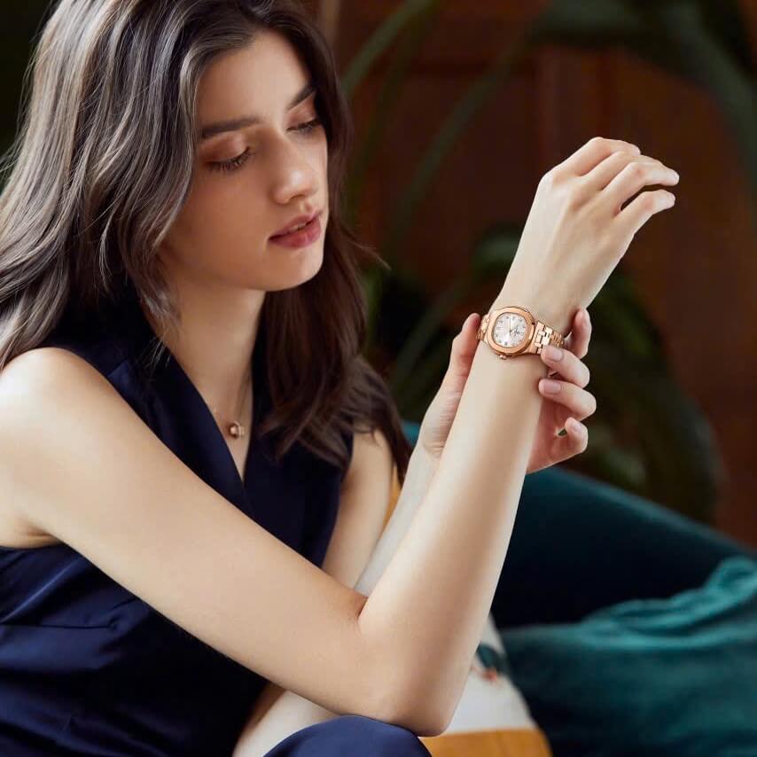 Vỏ đồng hồ được làm từ chất liệu thép không gỉ cao cấp, được mạ một lớp vàng hồng (rose gold) sang trọng, tạo nên sự nổi bật và quý phái cho chiếc đồng hồ. Màu vàng hồng này mang đến sự ấm áp, mềm mại, đồng thời tạo ra một vẻ đẹp cổ điển nhưng vẫn đầy hiện đại. Đây là sự lựa chọn hoàn hảo cho những ai yêu thích sự tinh tế, sang trọng nhưng không kém phần thời thượng.
