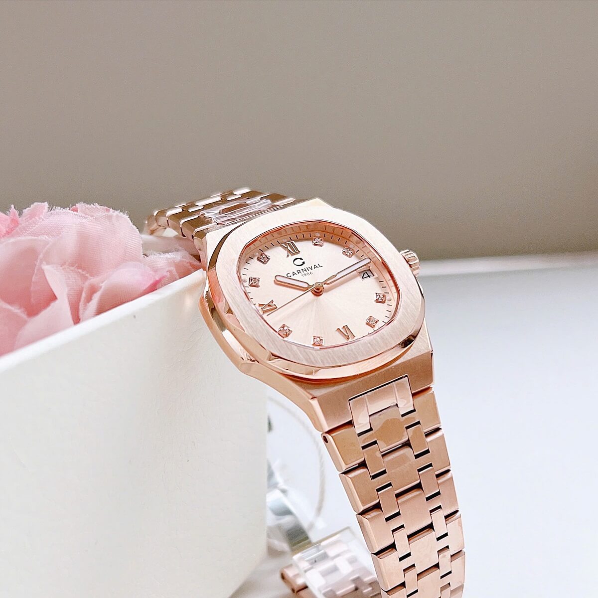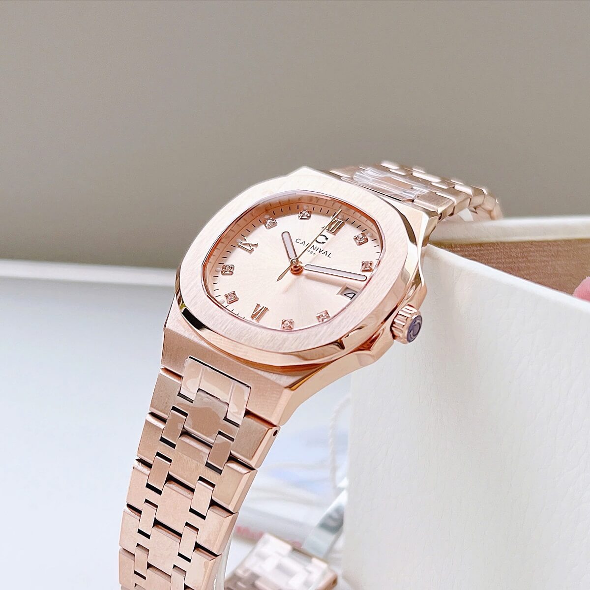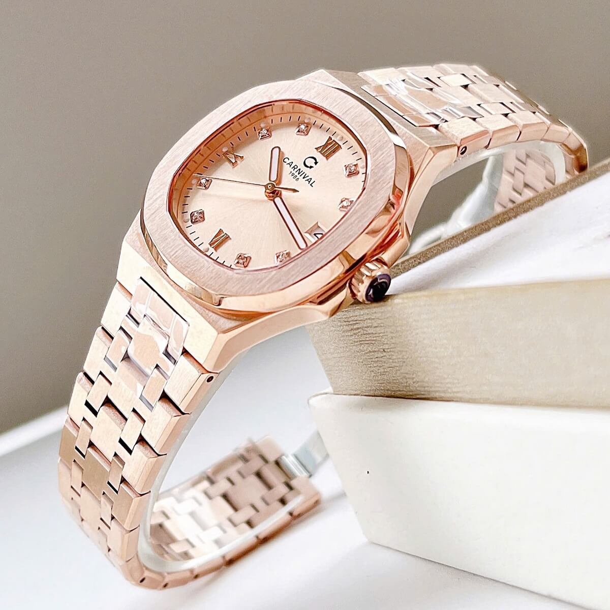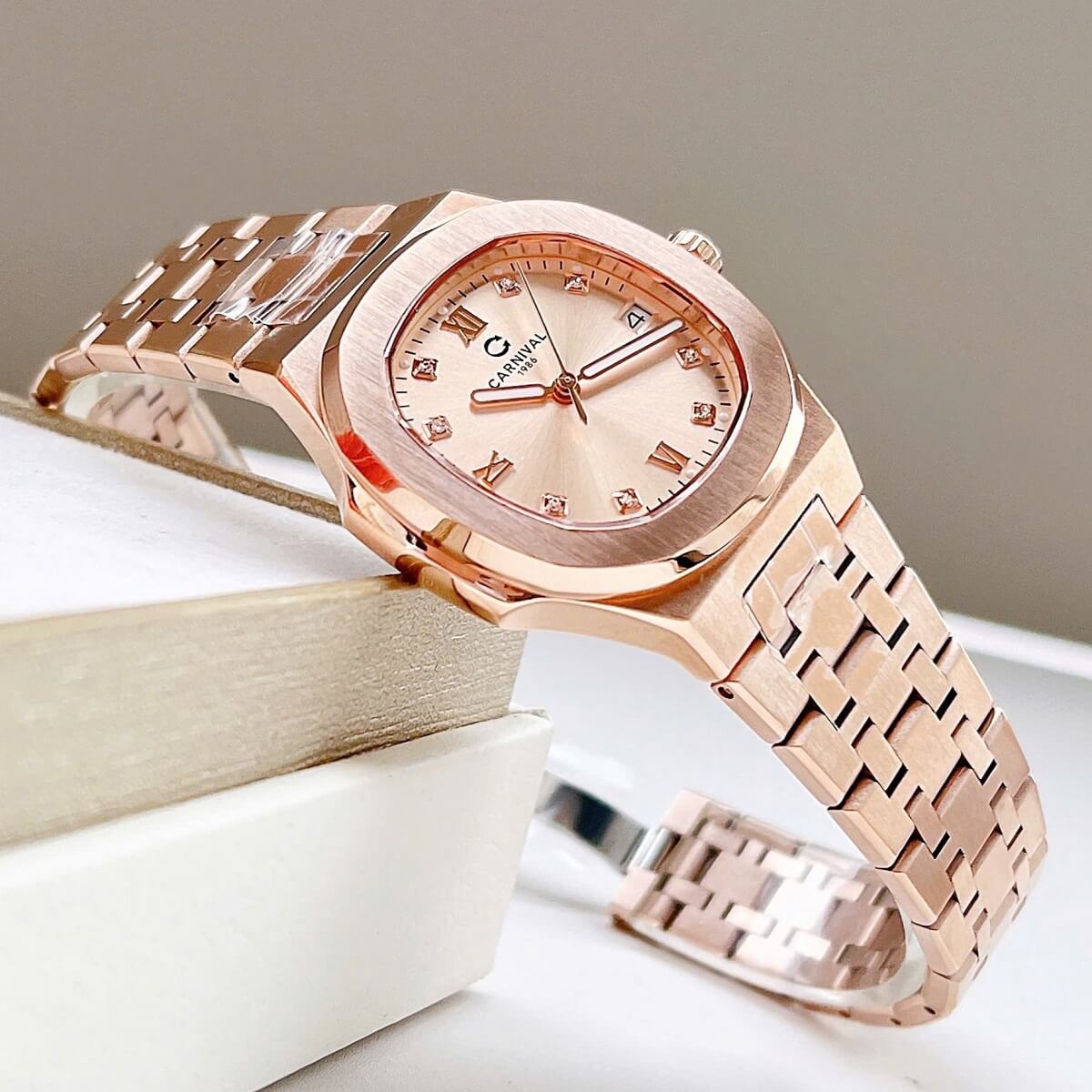 Màu sắc Rose Gold (vàng hồng) luôn là một trong những lựa chọn được yêu thích trong ngành đồng hồ nữ, mang đến vẻ đẹp quyến rũ, tinh tế và hiện đại. Với tông màu ấm áp, chiếc đồng hồ Carnival 8160L không chỉ dễ dàng phối hợp với nhiều trang phục, từ váy dạ hội đến trang phục công sở, mà còn thể hiện được sự nữ tính và sang trọng của người sở hữu.