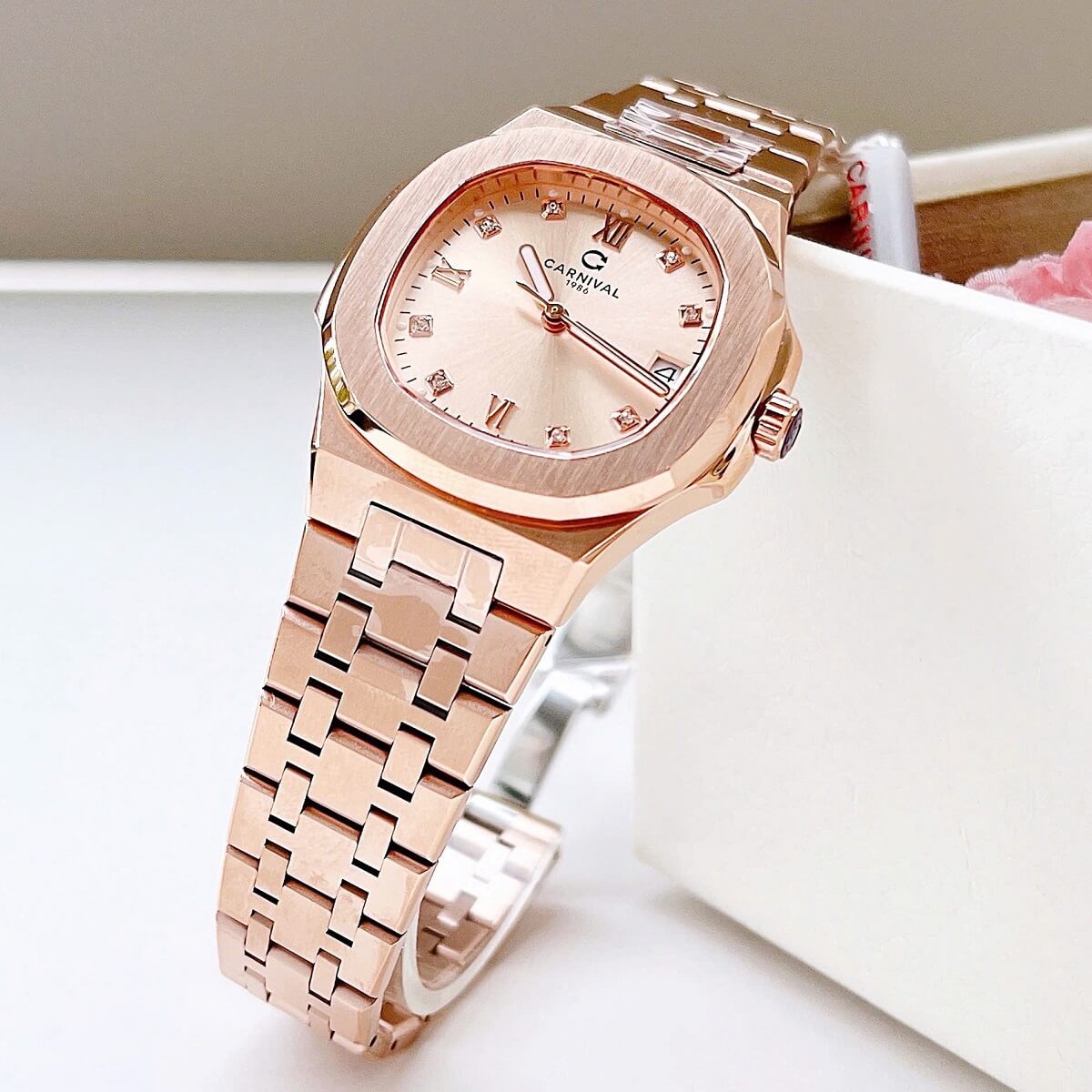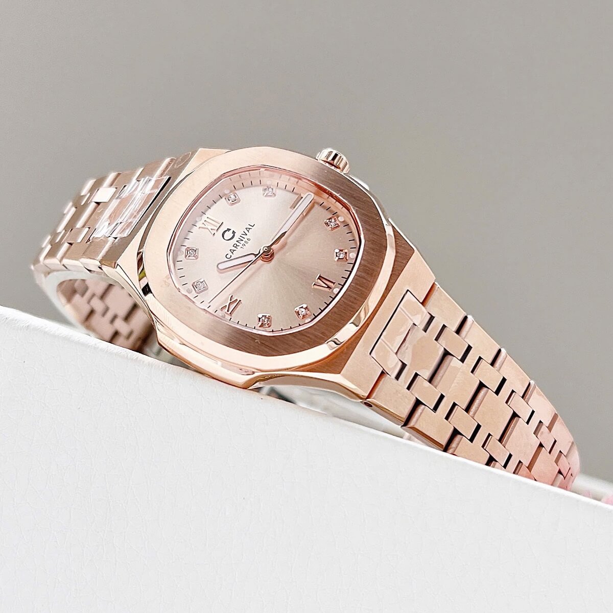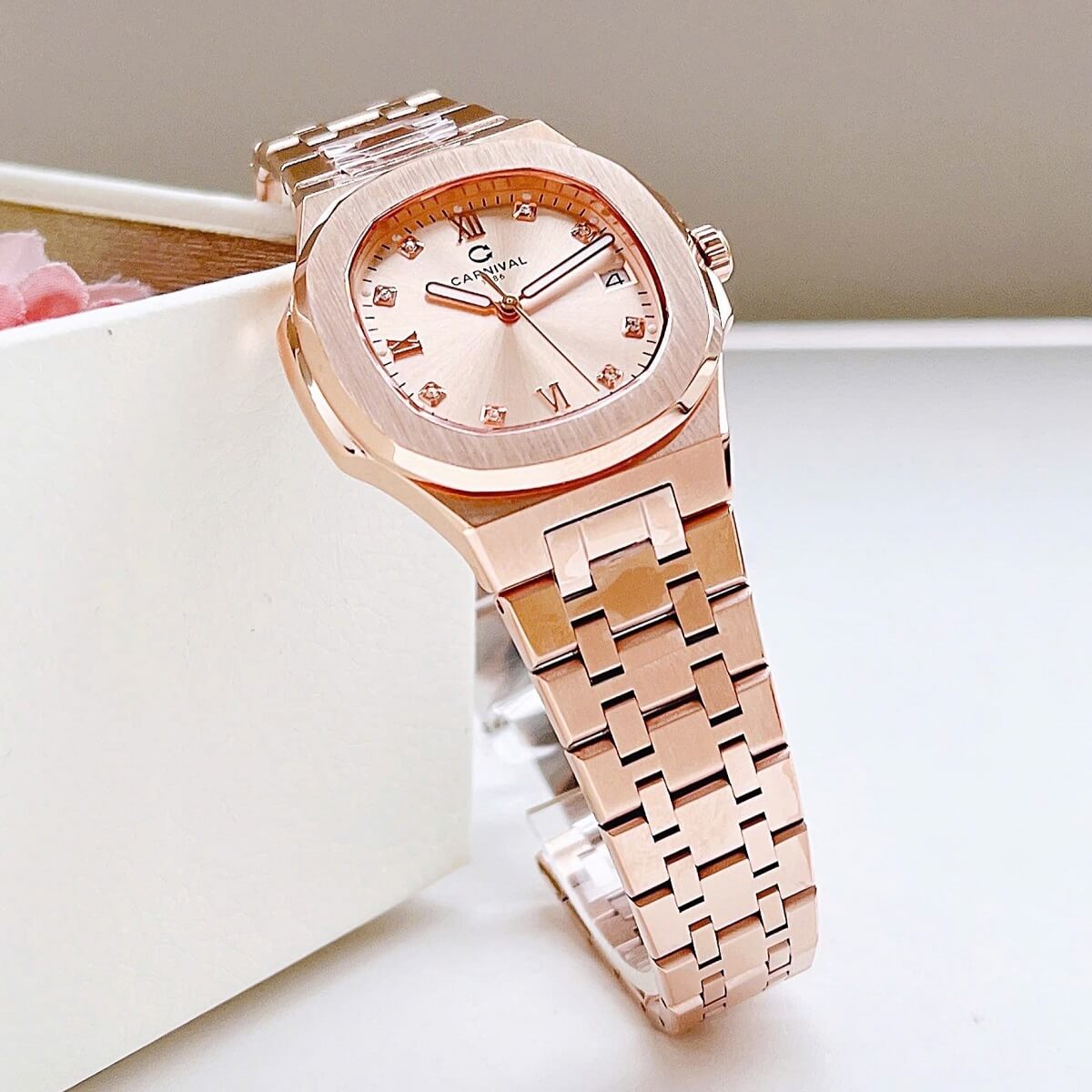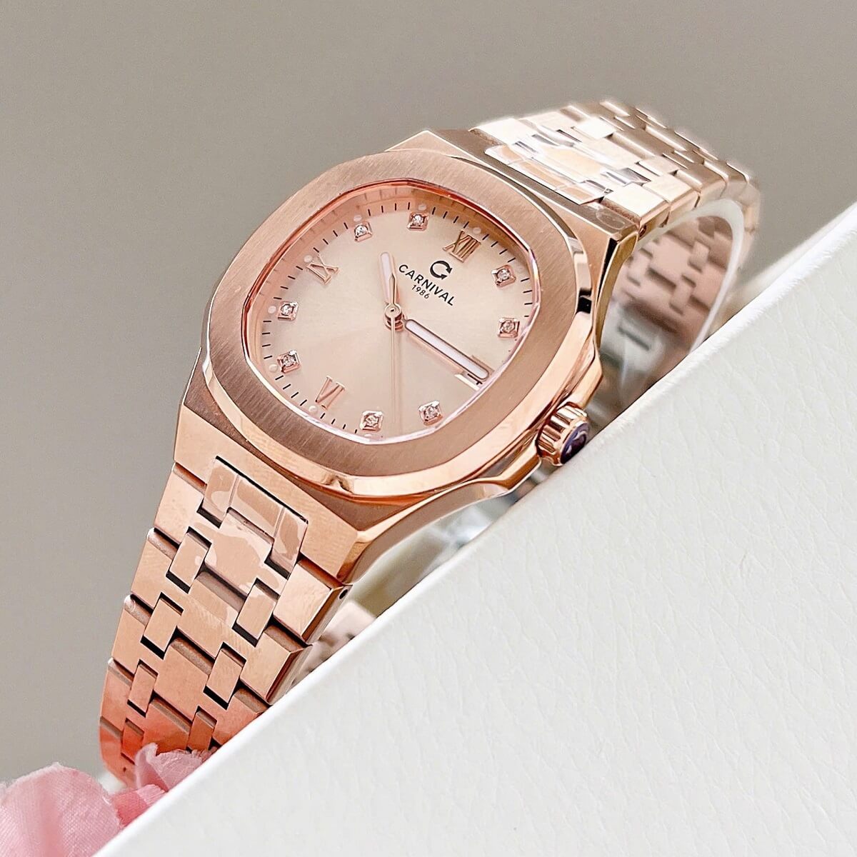 Màu sắc Rose Gold (vàng hồng) luôn là một trong những lựa chọn được yêu thích trong ngành đồng hồ nữ, mang đến vẻ đẹp quyến rũ, tinh tế và hiện đại. Với tông màu ấm áp, chiếc đồng hồ Carnival 8160L không chỉ dễ dàng phối hợp với nhiều trang phục, từ váy dạ hội đến trang phục công sở, mà còn thể hiện được sự nữ tính và sang trọng của người sở hữu.