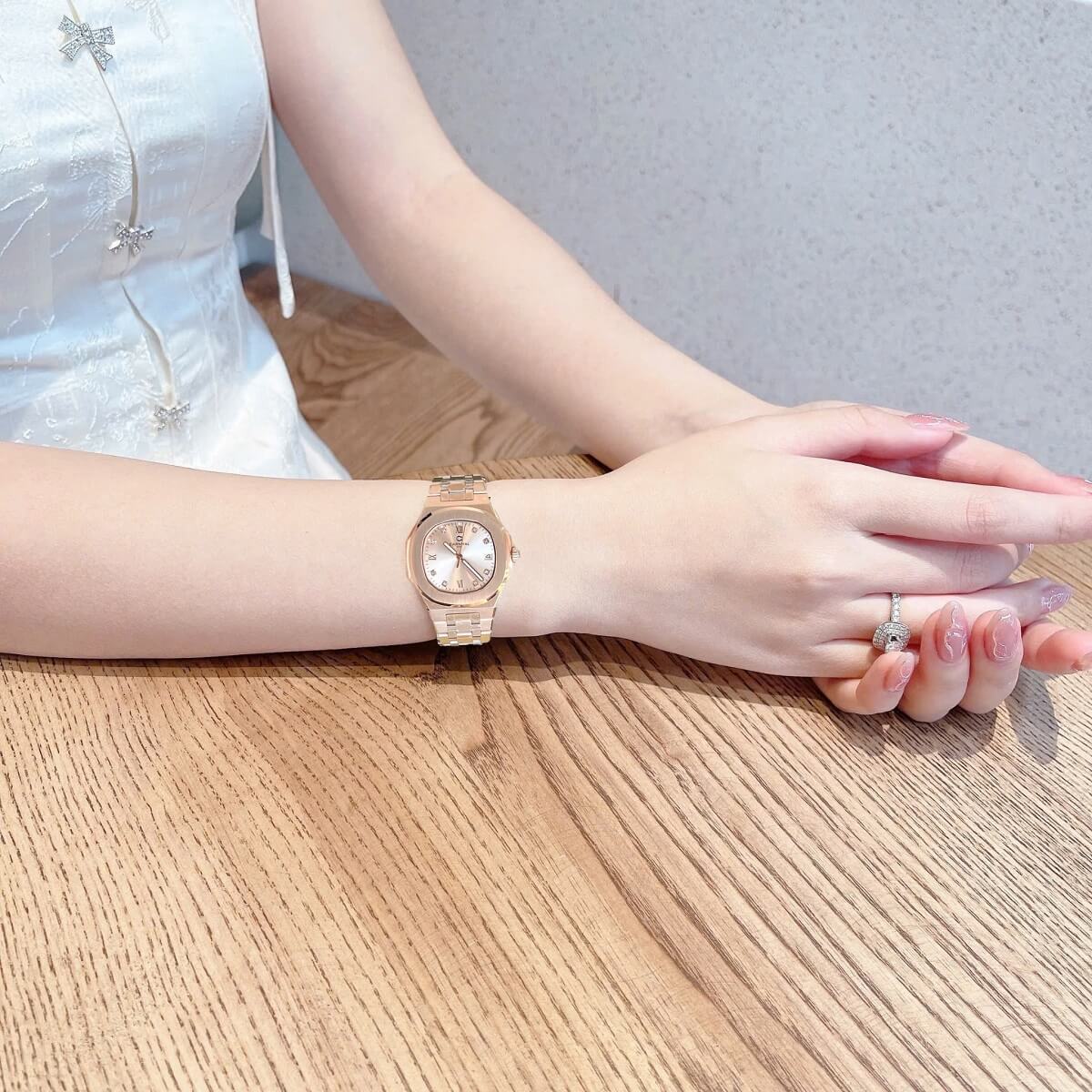 Phong cách thời trang: Màu sắc rose gold và thiết kế thanh lịch giúp bạn dễ dàng kết hợp với mọi bộ trang phục, từ công sở đến đi chơi.