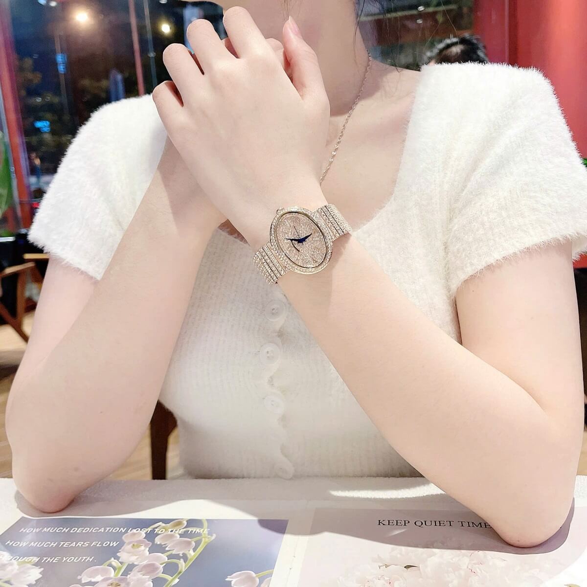 Viền và mặt đồng hồ được đính kín đá pha lê lấp lánh, phản chiếu ánh sáng tinh tế, mang lại hiệu ứng thị giác bắt mắt, sang trọng tuyệt đối.