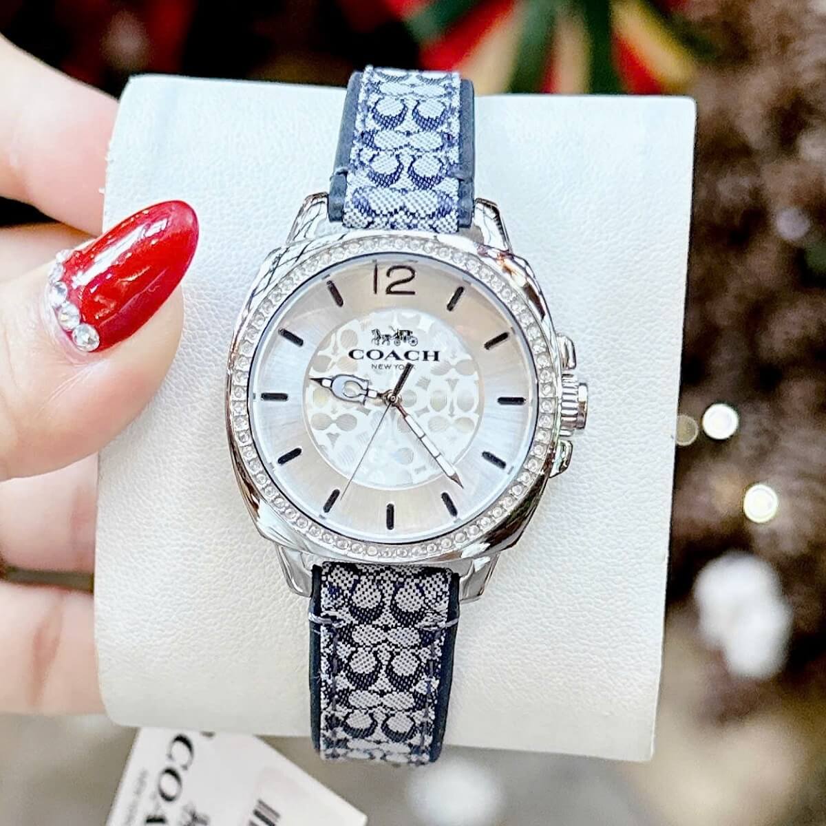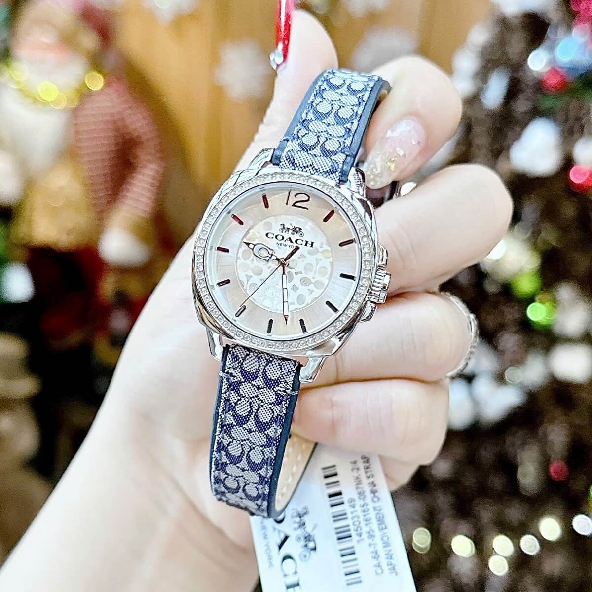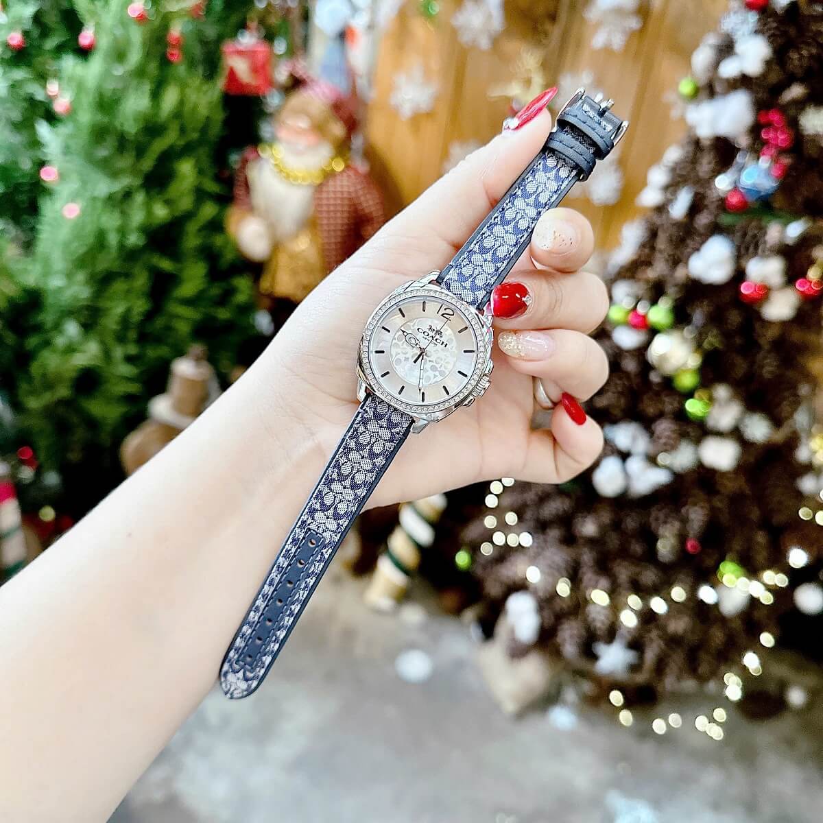 Mẫu Coach 14503149 mang đến vẻ đẹp hiện đại pha nét thanh lịch, với dây da xanh mềm mại ôm tay, kết hợp vỏ thép không gỉ màu bạc và viền đính đá lấp lánh tạo điểm nhấn sang trọng. Mặt 34mm vừa vặn cổ tay, dễ phối đồ từ công sở đến đi chơi, dự tiệc.