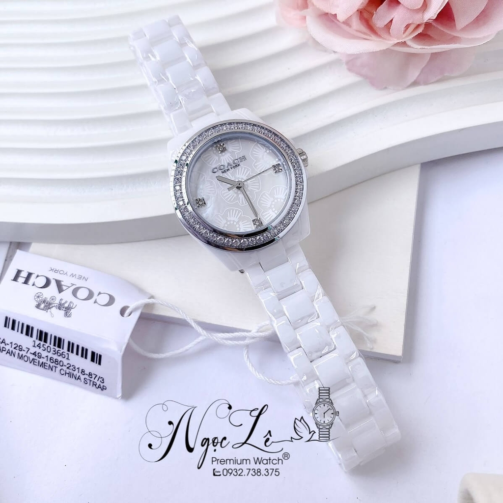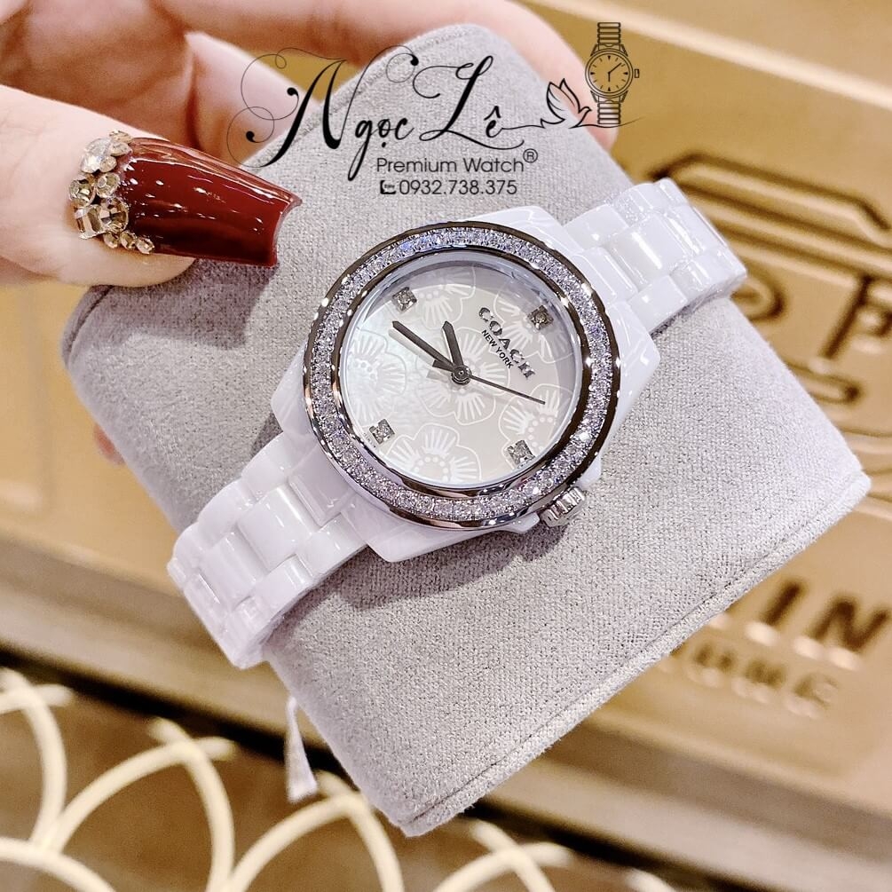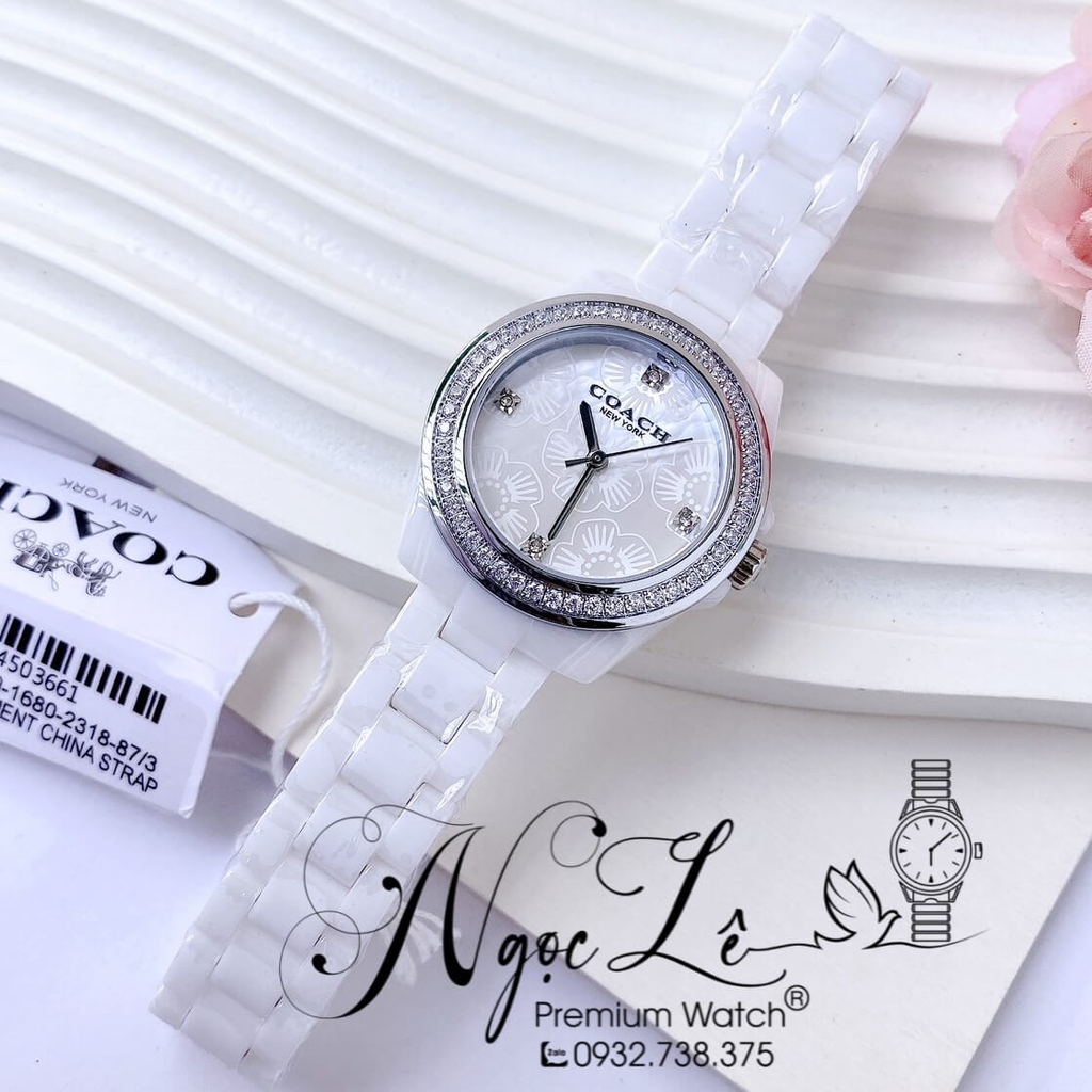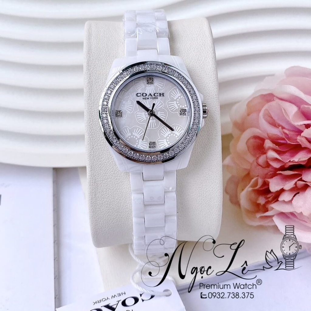 Đồng Hồ Nữ Coach Dây Đá Ceramic Trắng Đính Đá Silver Mặt Họa Tiết Hoa Size 32mm Full Box