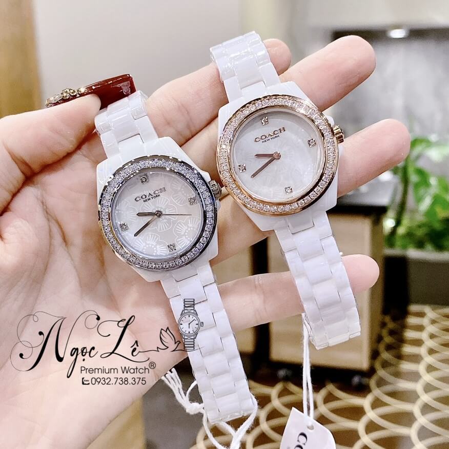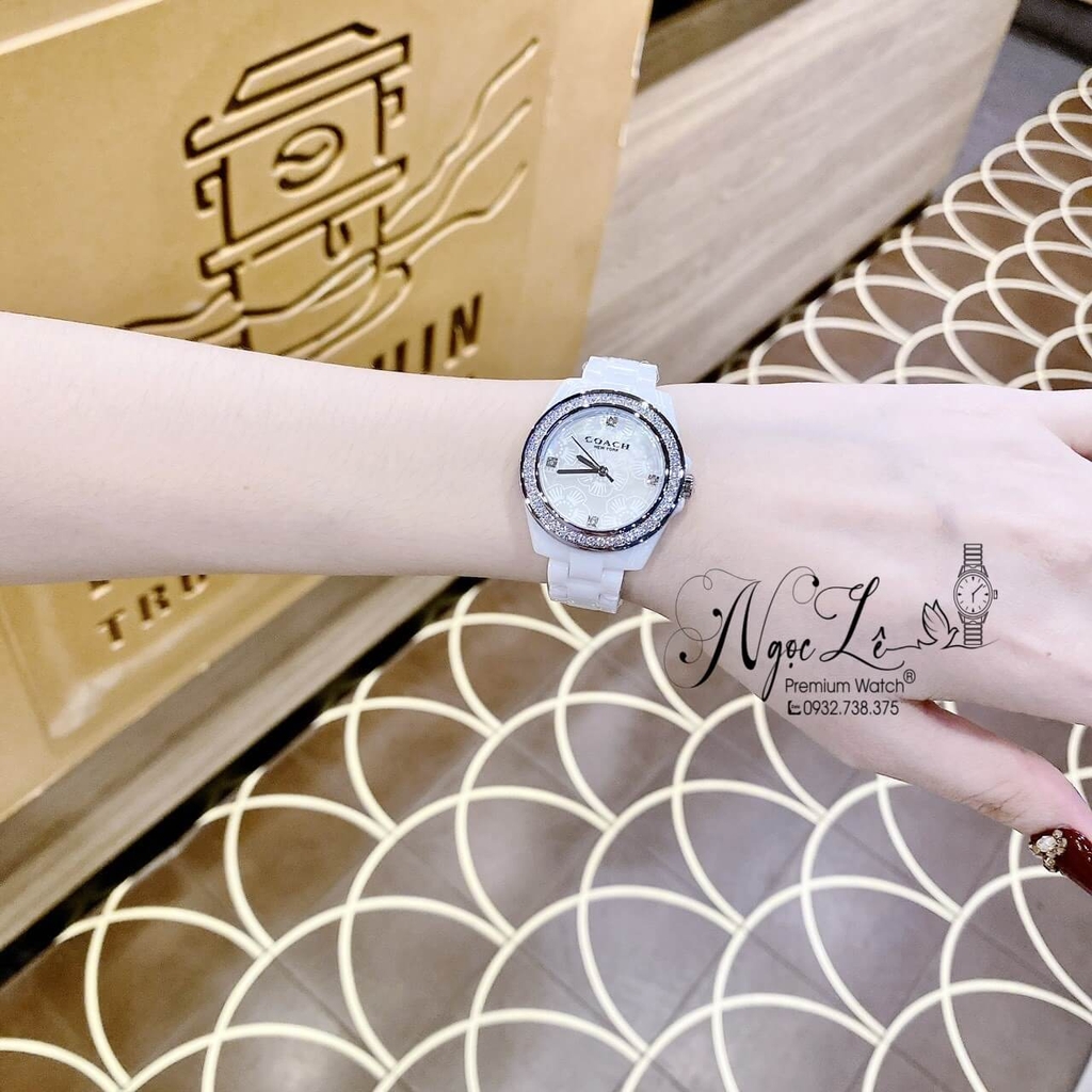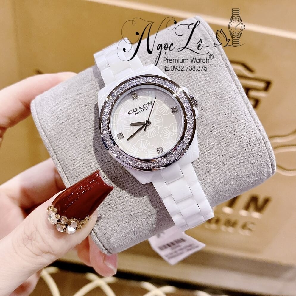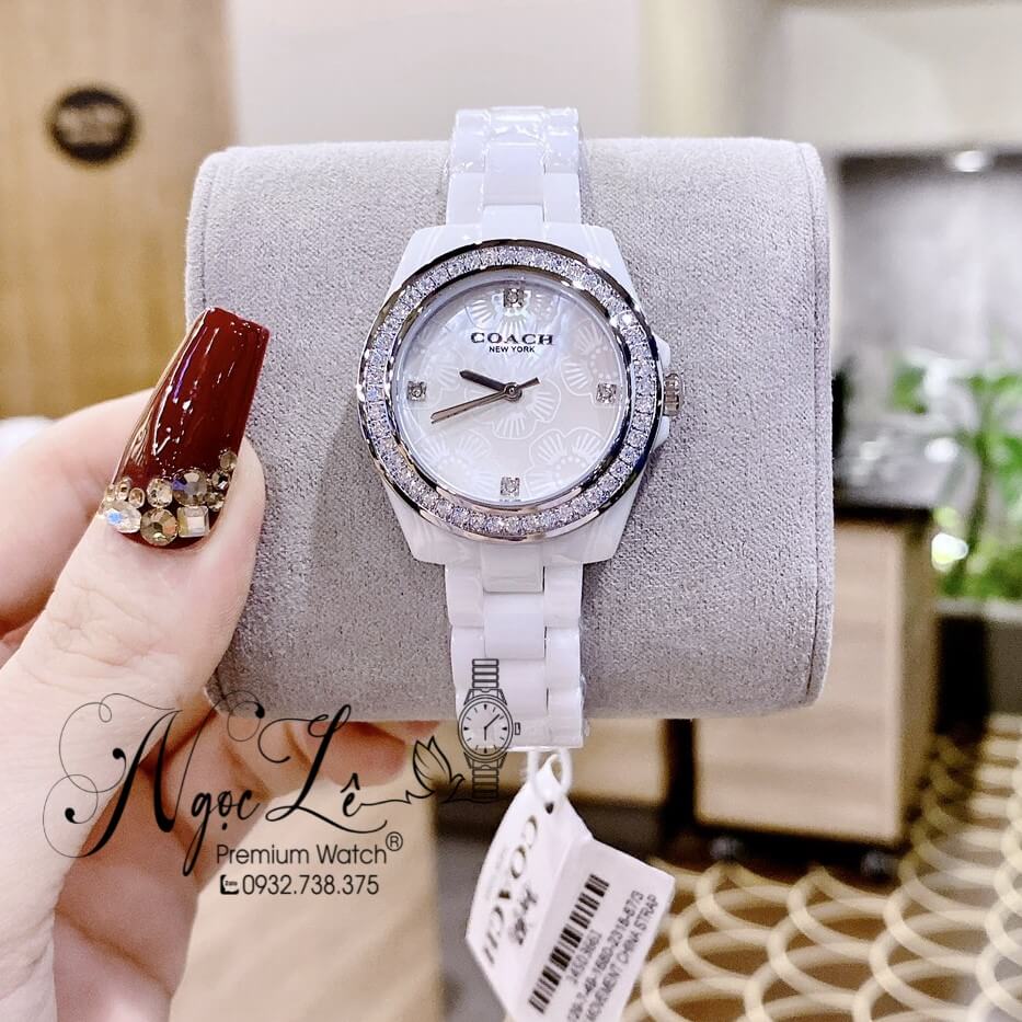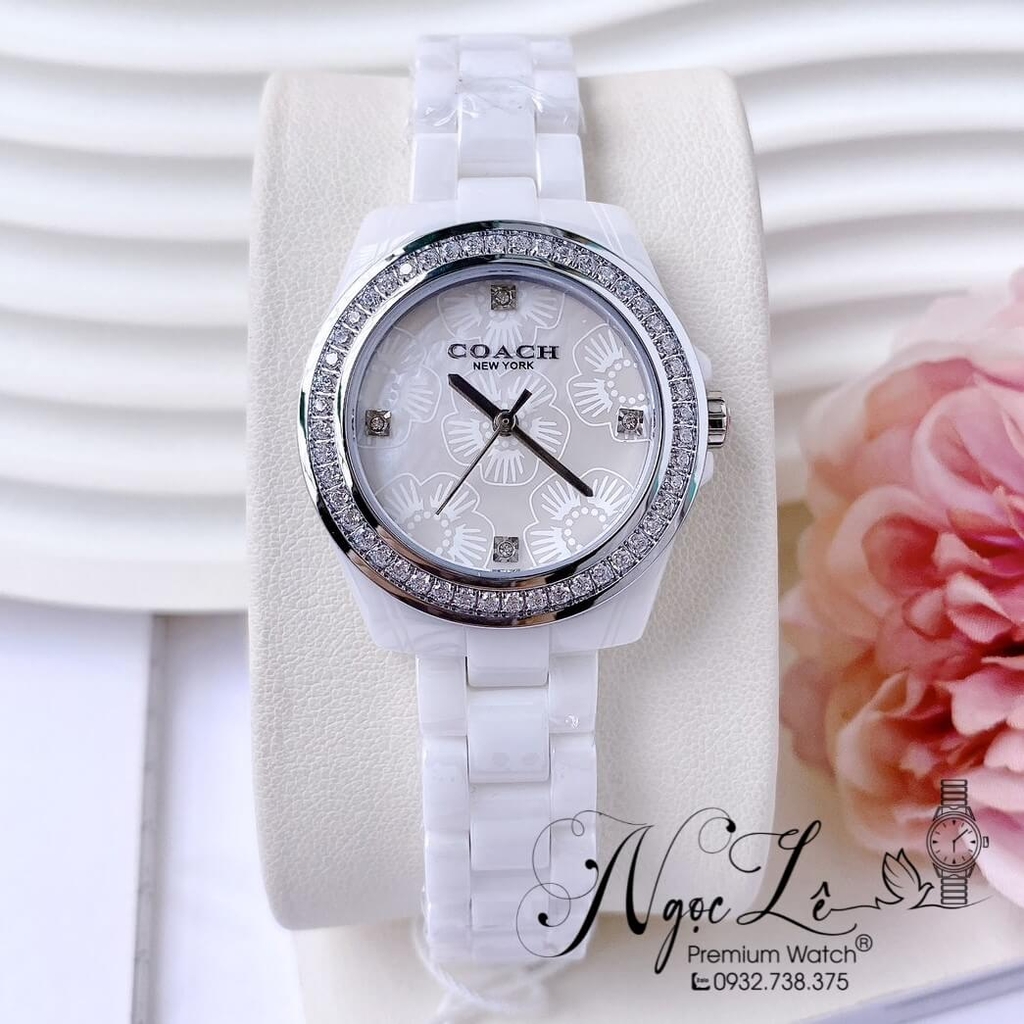 Đồng Hồ Nữ Coach Dây Đá Ceramic Trắng Đính Đá Silver Mặt Họa Tiết Hoa Size 32mm Full Box