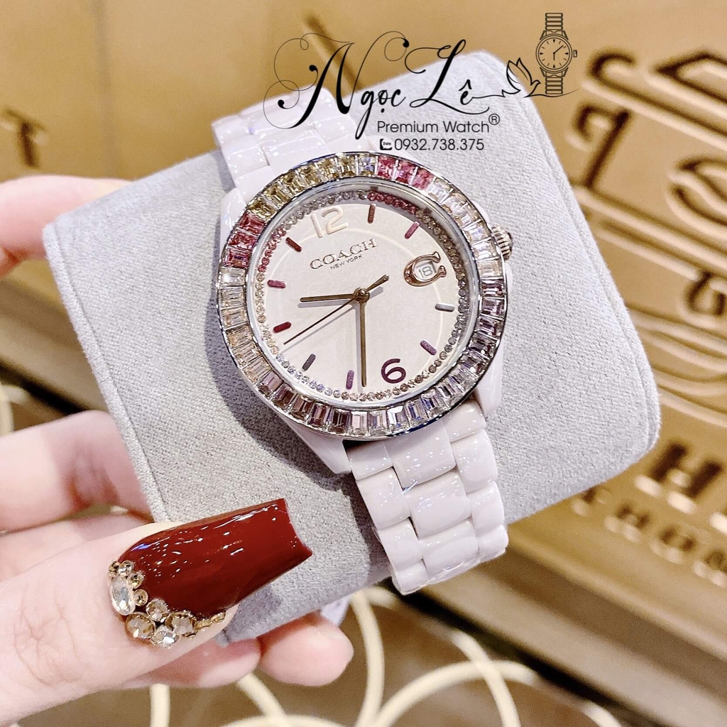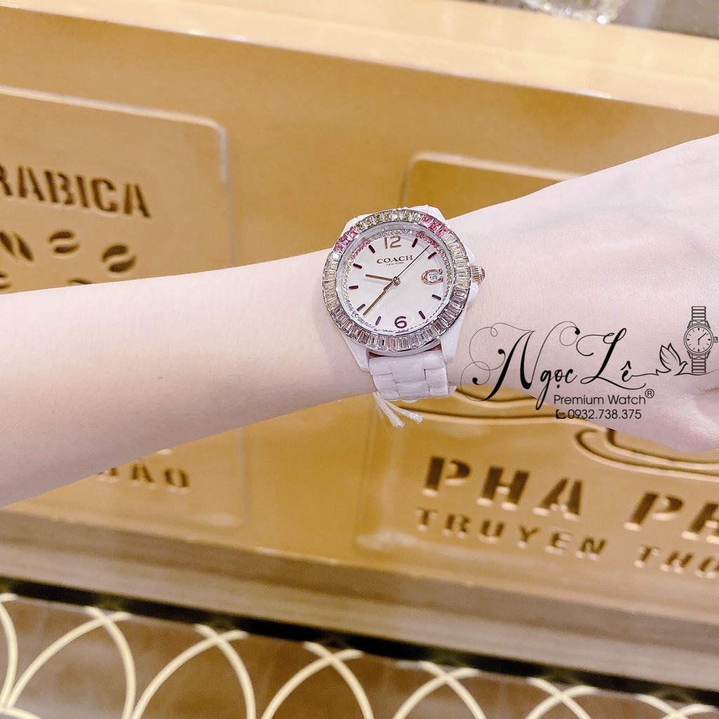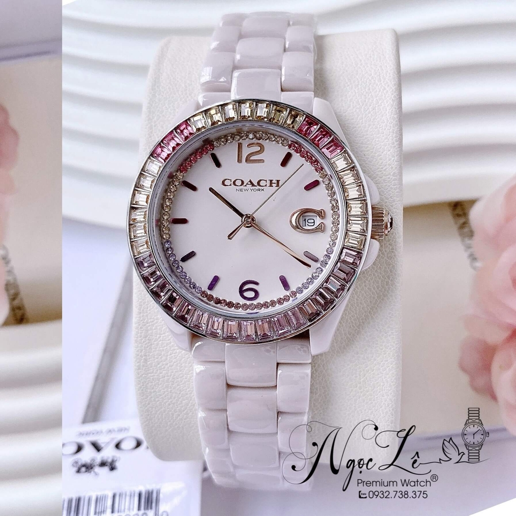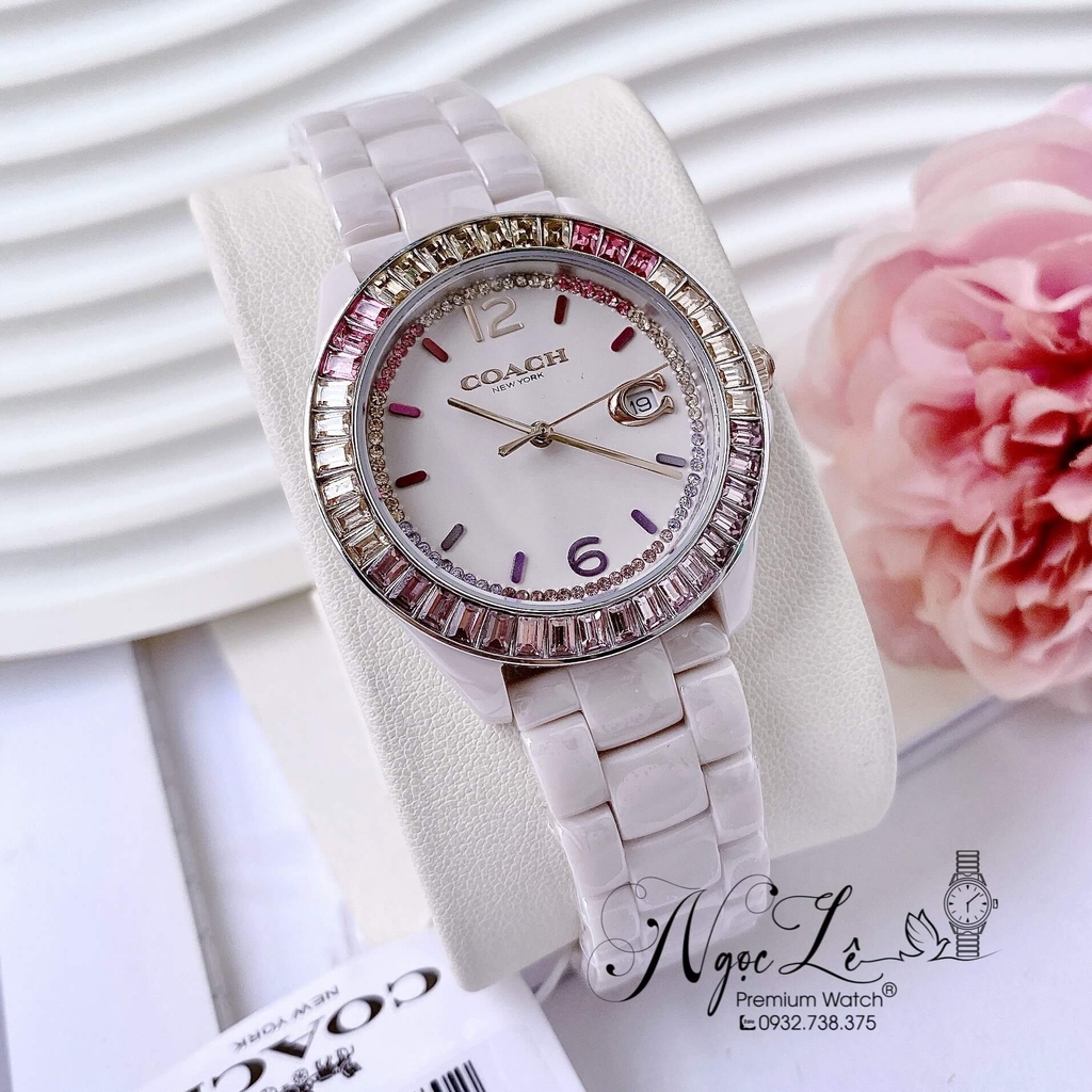 Đồng Hồ Nữ Coach Dây Đá Ceramic Trắng Hồng Đính Đá Màu Size 36mm Full Box