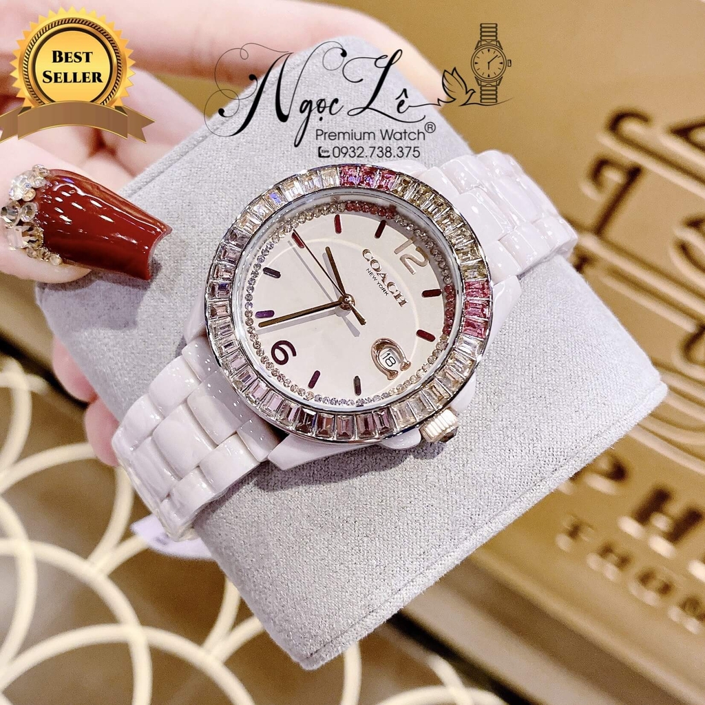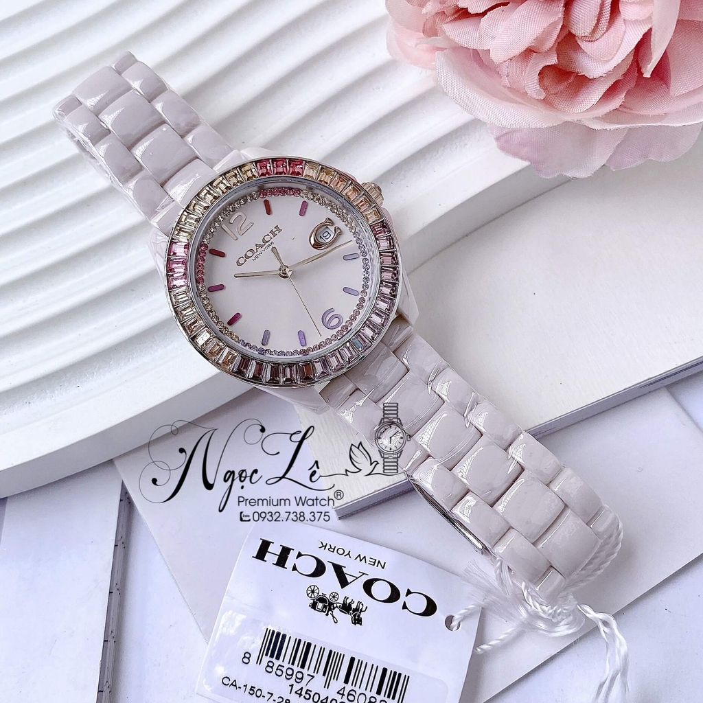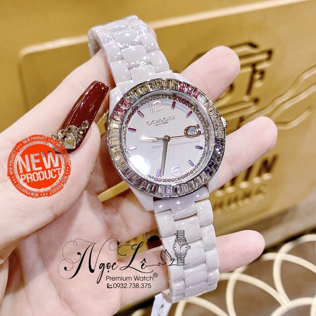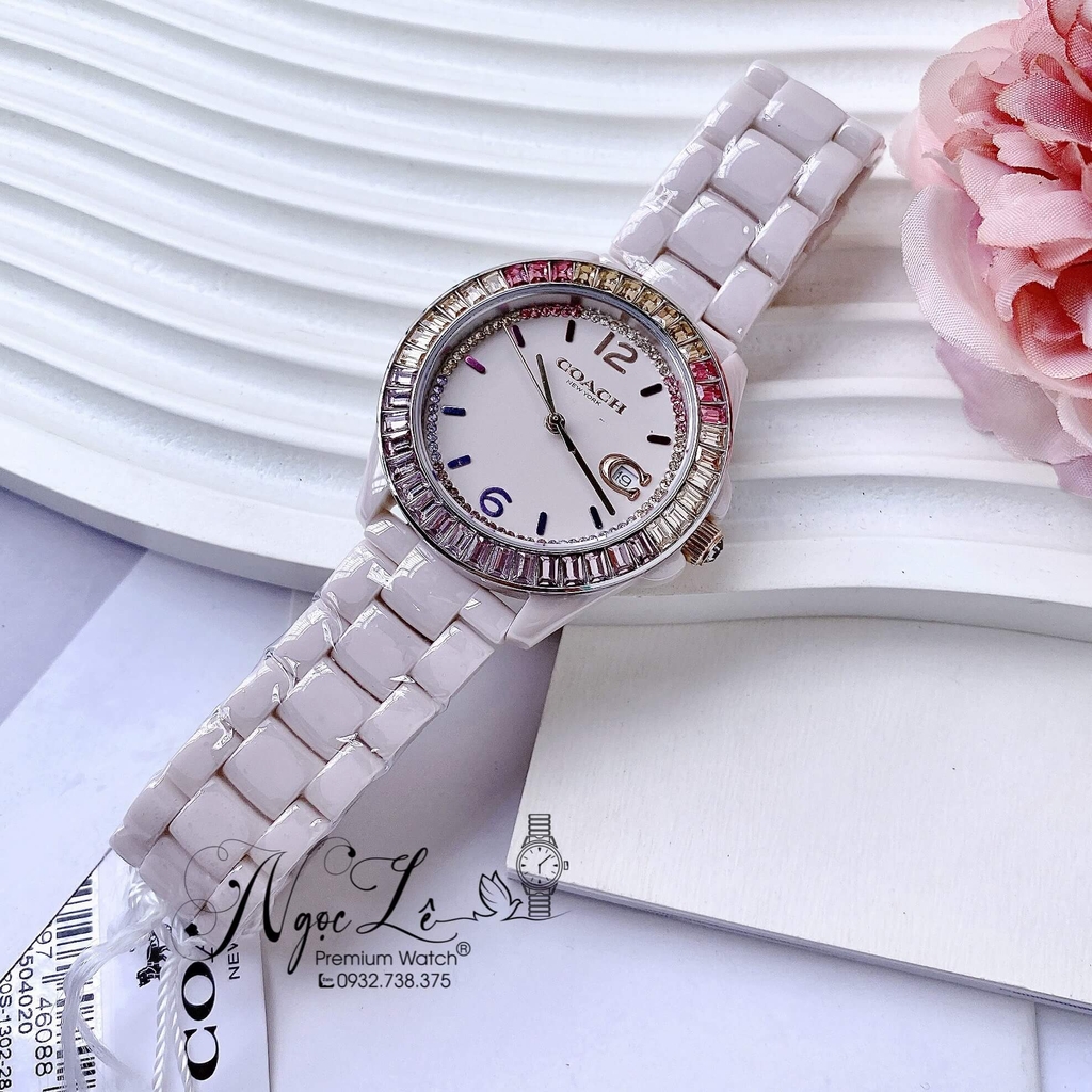 Đồng Hồ Nữ Coach Dây Đá Ceramic Trắng Hồng Đính Đá Màu Size 36mm Full Box