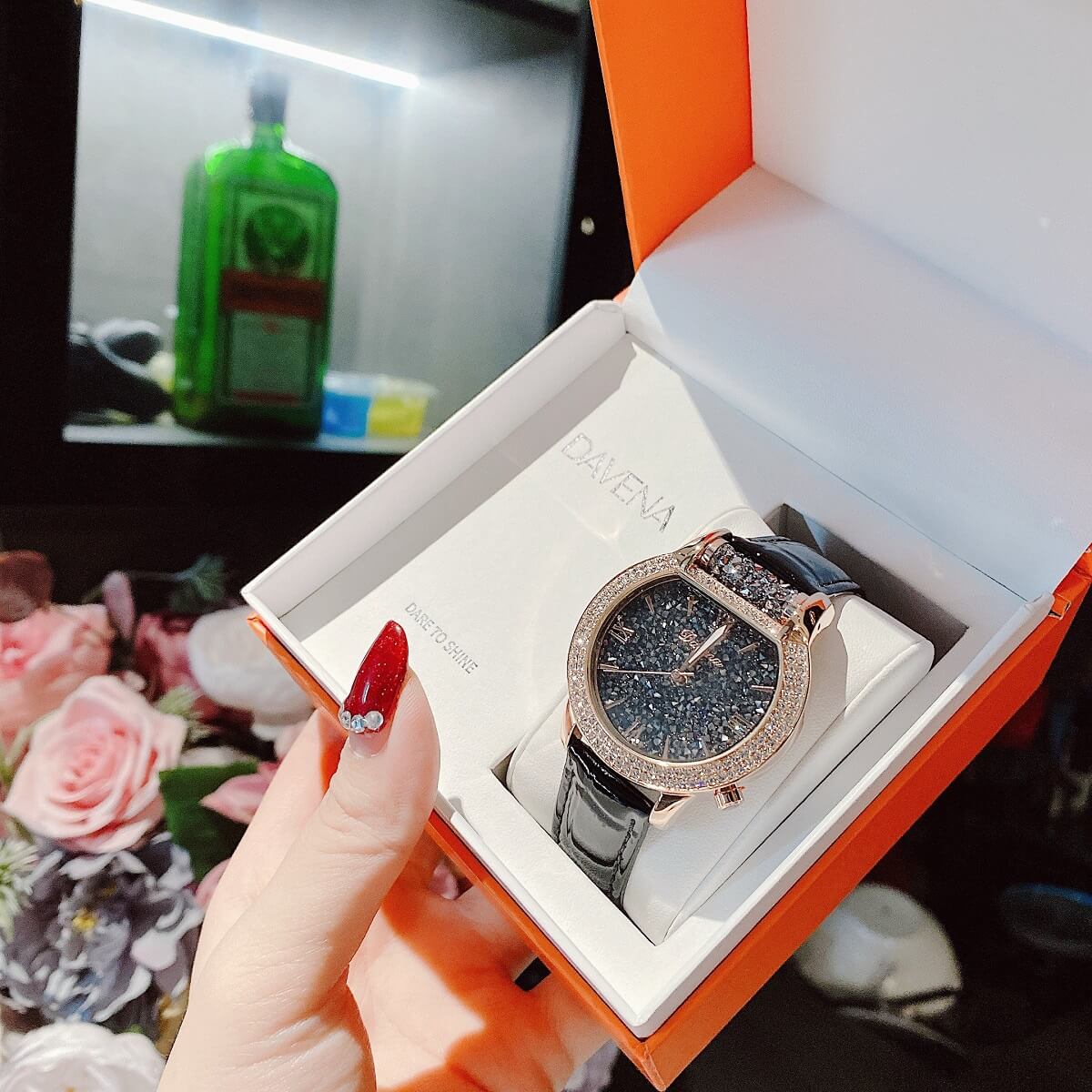 Đồng Hồ Nữ Davena 31683 Dây Da Đen Rose Gold 38mm chính hãng máy Nhật