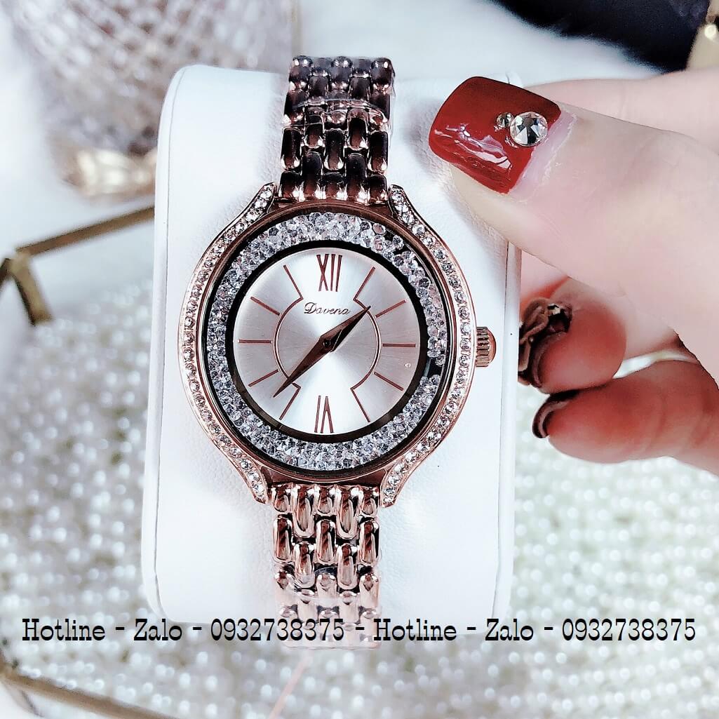 Hình ảnh đồng hồ Davena nữ chính hãng, đồng hồ mặt tròn đá chảy màu vàng hồng sang trọng dành cho nữ