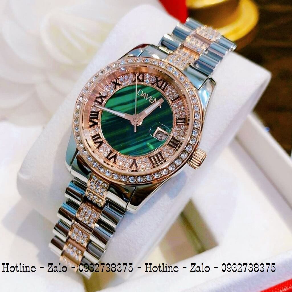Hình ảnh đồng hồ Davena nữ chính hãng, đồng hồ mặt tròn đính đá màu demi vàng hồng sang trọng dành cho nữ, kiểu dáng đồng hồ Rolex