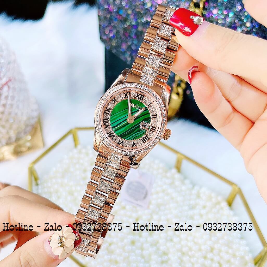 Hình ảnh đồng hồ Davena nữ chính hãng, đồng hồ mặt tròn đính đá màu vàng hồng sang trọng dành cho nữ, kiểu dáng đồng hồ Rolex