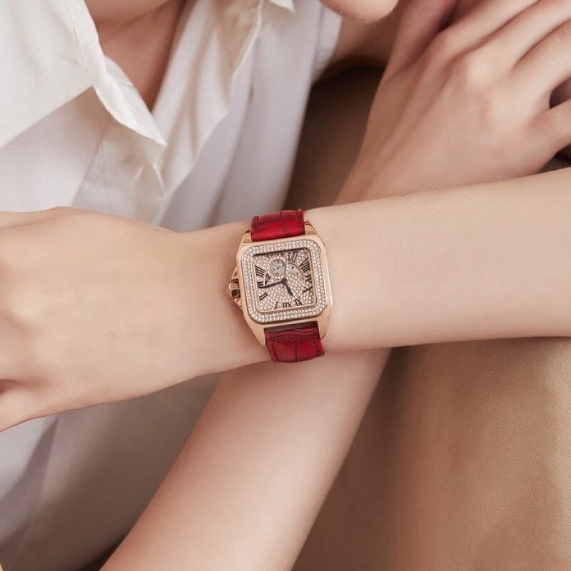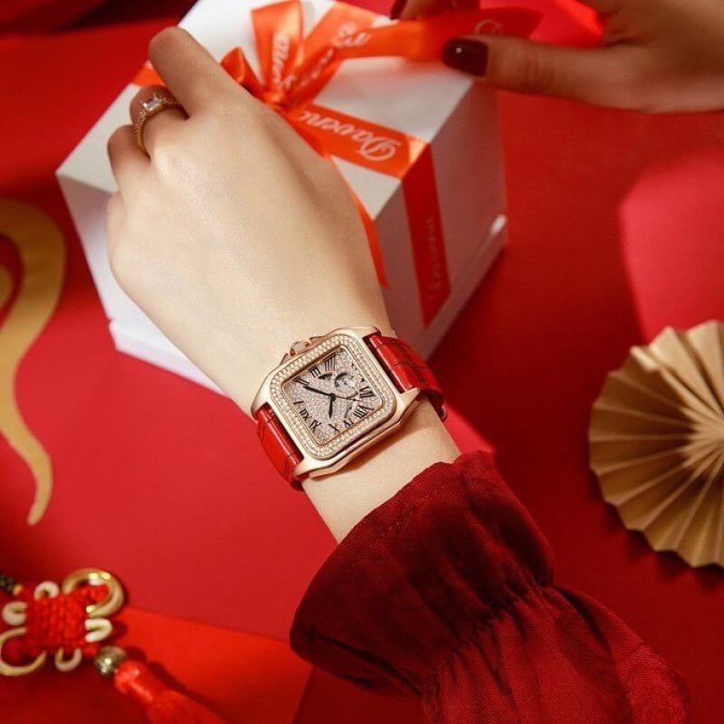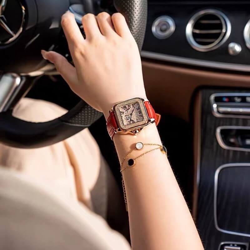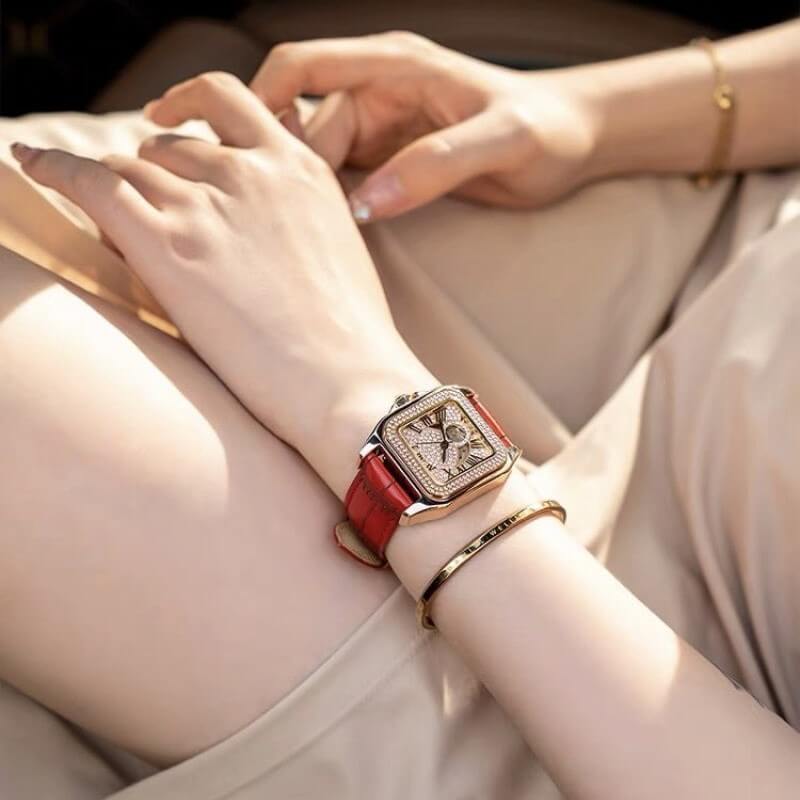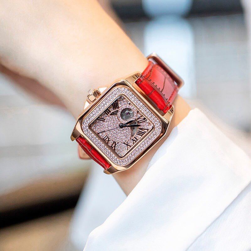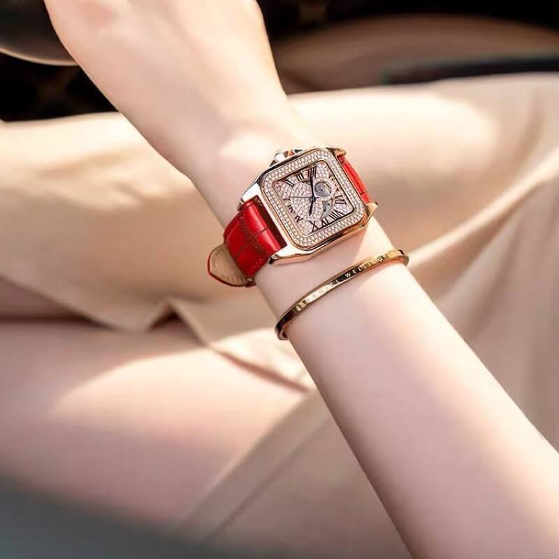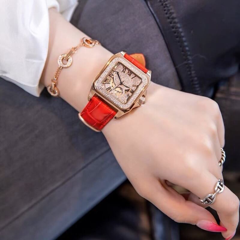 - Size 33mm, form vuông dành cho tay nữ size tầm trung trở lên, mặt đính đá lấp lánh với dây da bền bỉ ôm tay