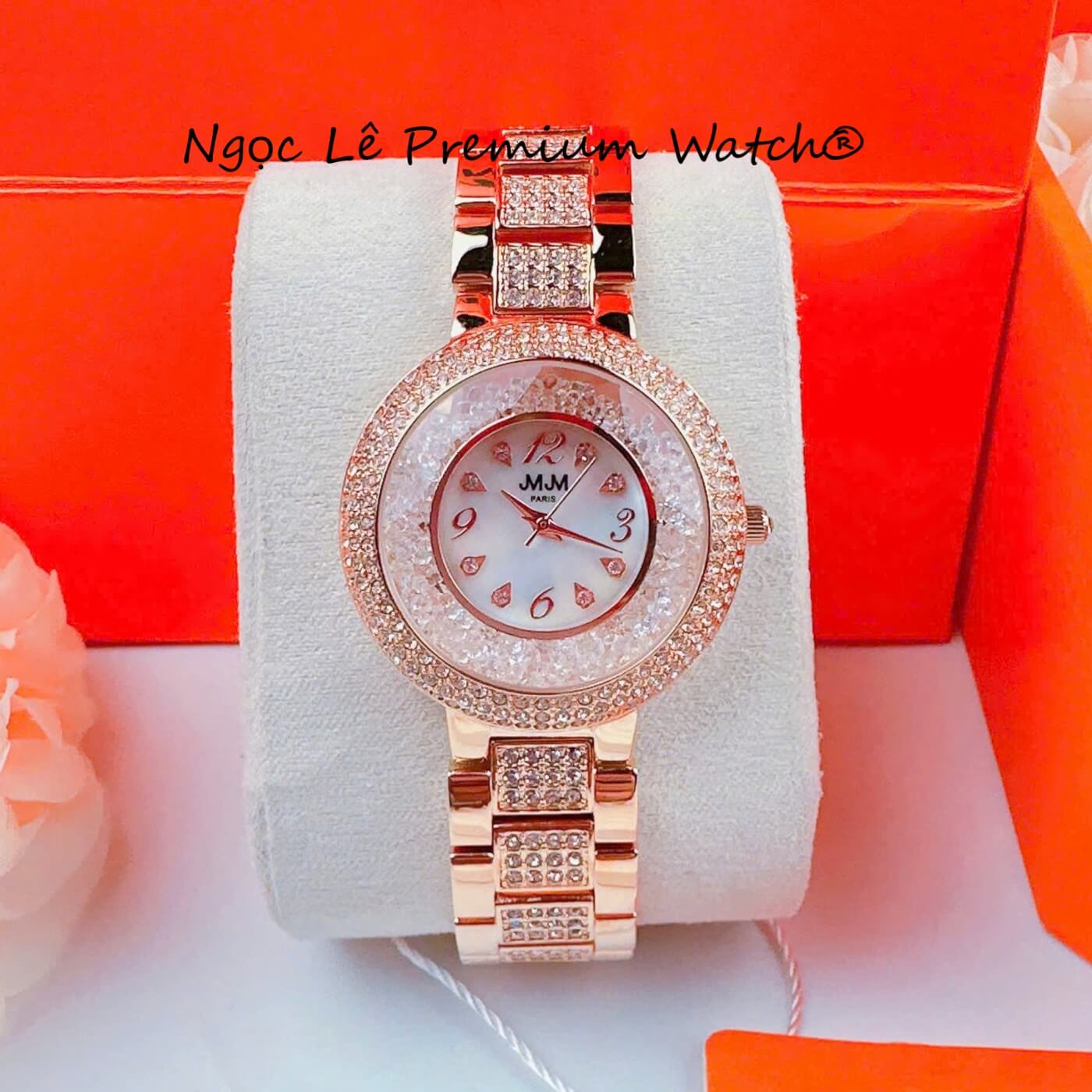 Bên trong mặt đồng hồ được đính đá hình dạng diamond ở 12 vị trí xem giờ tạo điểm nhấn, giúp dễ xem giờ hơn. Size mặt đồng hồ 34mm vừa vặn ôm tay, khóa bấm chắc chắn tạo sự tự tin cho người đeo