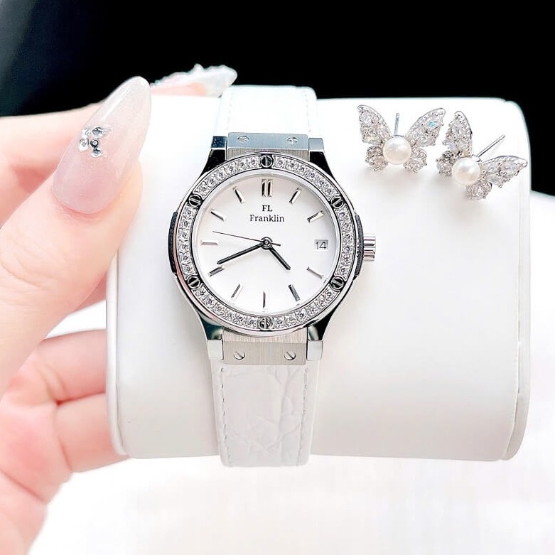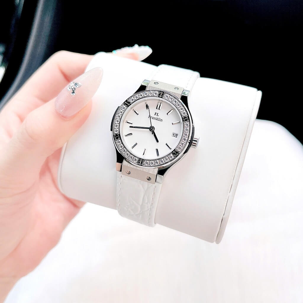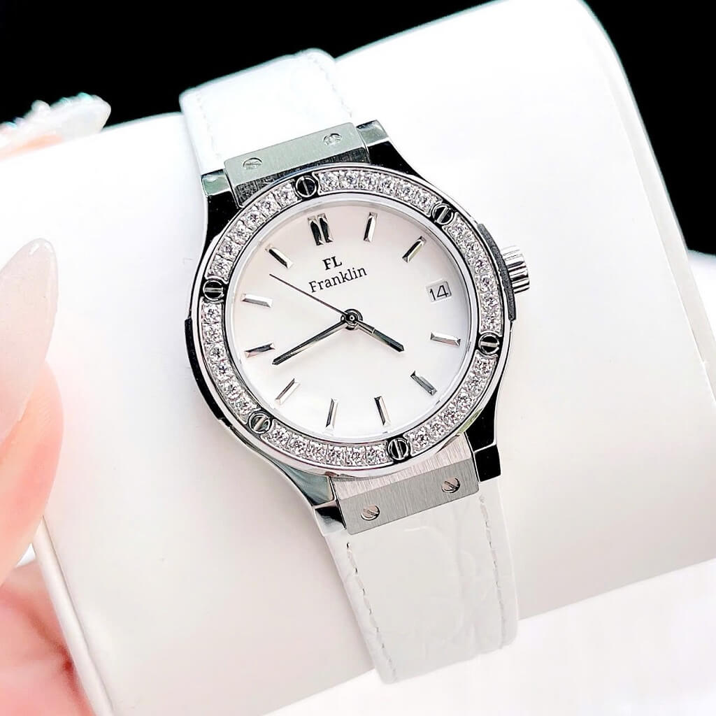 Thông số chi tiết sản phẩm: Đồng Hồ Nữ Franklin Dây Da Trắng Vỏ Màu Silver Đính Đá Size 31mm Chính Hãng