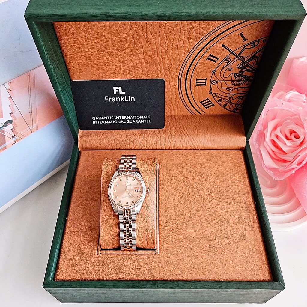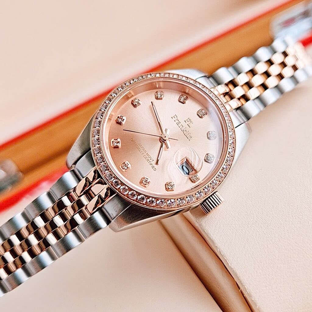 Thông số chi tiết sản phẩm: Đồng Hồ Nữ Franklin Dây Vỏ Inox Demi Rose Đính Đá Size 28mm Chính Hãng