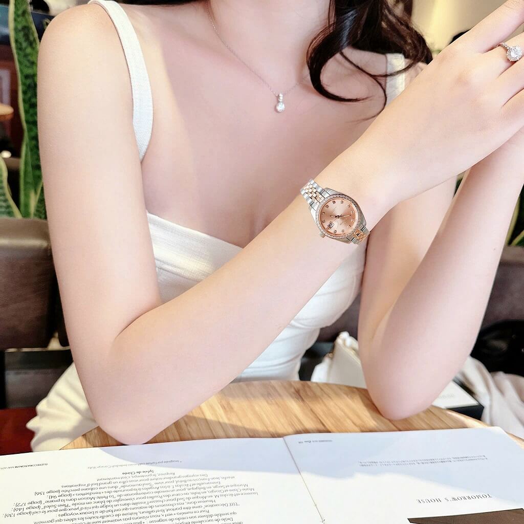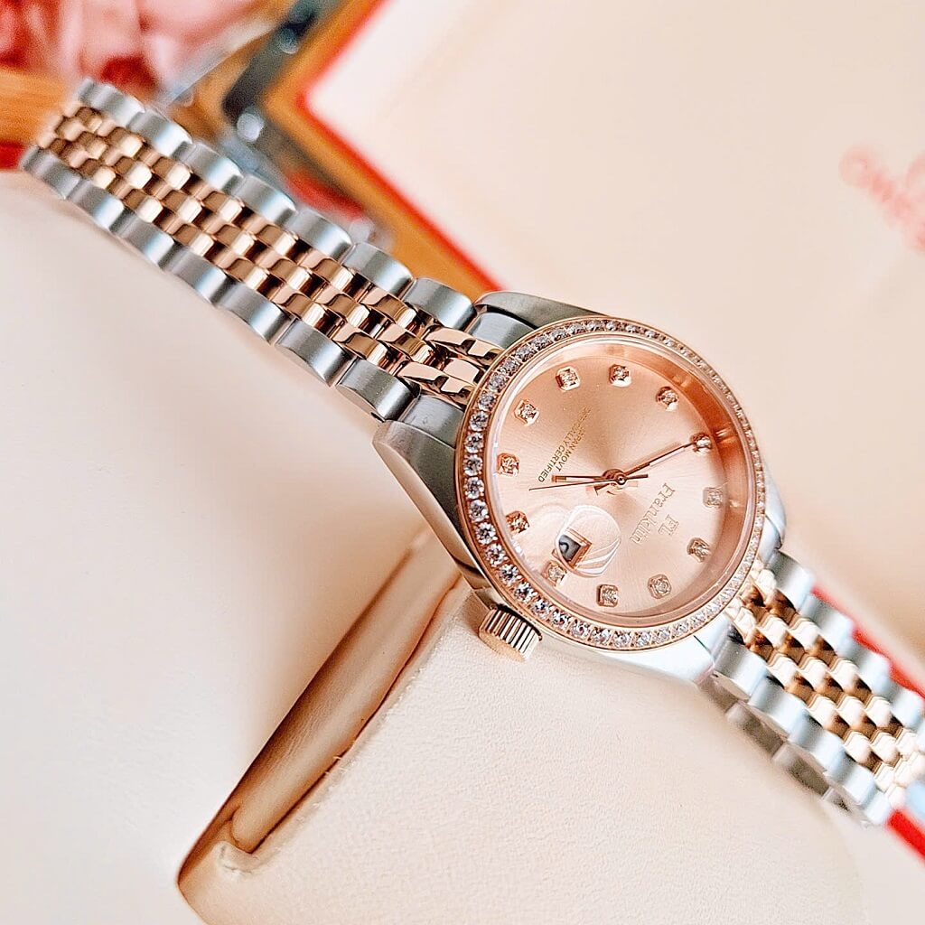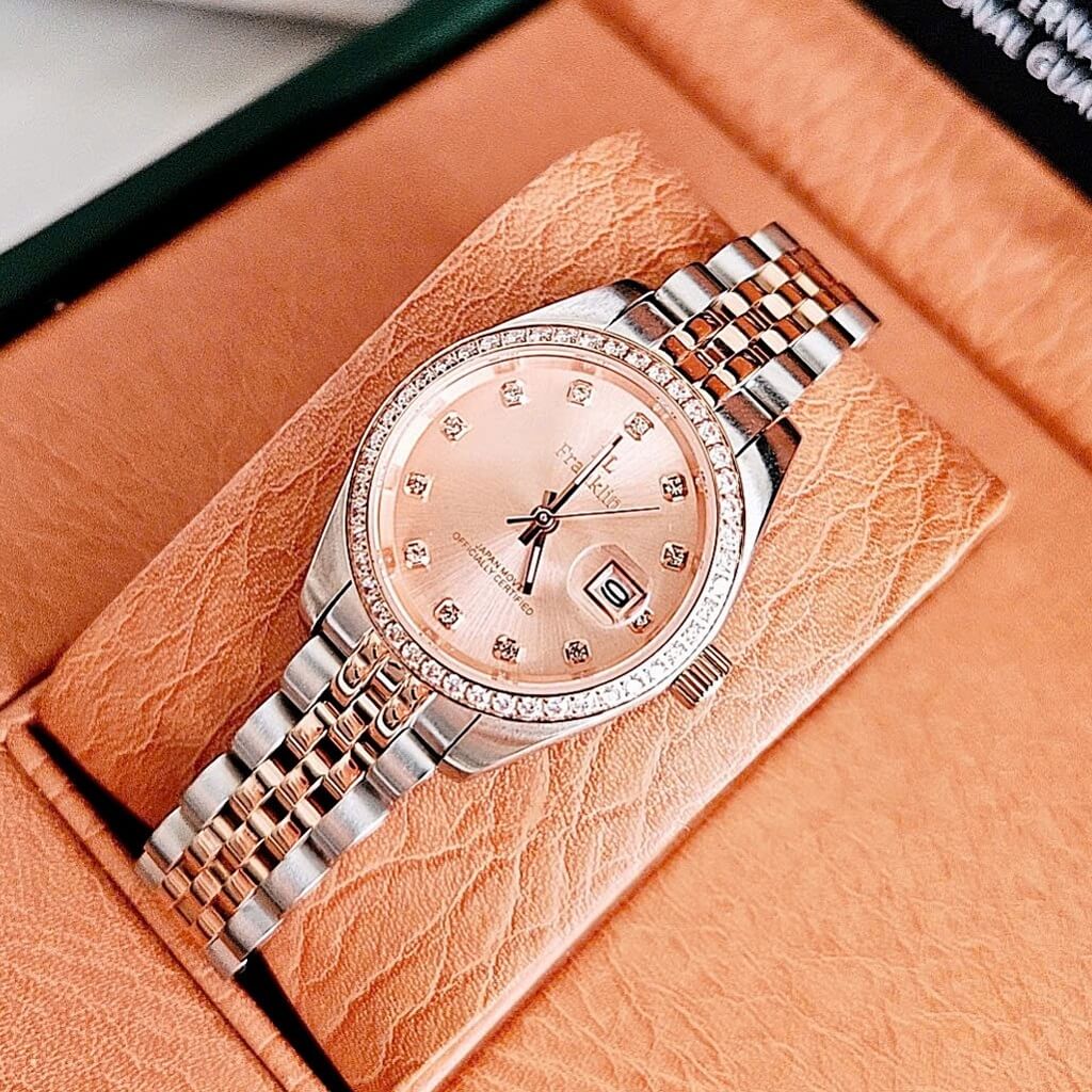 Đính đá sang trọng: Mặt số đồng hồ được đính đá quý, tạo điểm nhấn lấp lánh và sang trọng, làm tăng giá trị thẩm mỹ cho sản phẩm.