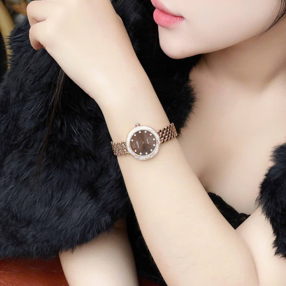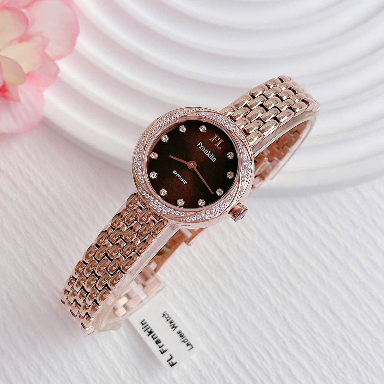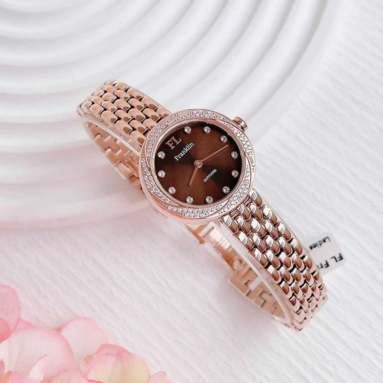 Một trong những điểm nhấn đặc biệt của chiếc đồng hồ Franklin này chính là những viên đá nhỏ được đính xung quanh mặt đồng hồ, tạo nên sự lấp lánh và thu hút sự chú ý ngay từ cái nhìn đầu tiên. Những viên đá này không chỉ làm tăng vẻ đẹp của sản phẩm mà còn thể hiện sự tỉ mỉ trong từng chi tiết thiết kế. Đây là một lựa chọn lý tưởng cho những ai yêu thích sự nhẹ nhàng nhưng vẫn nổi bật.