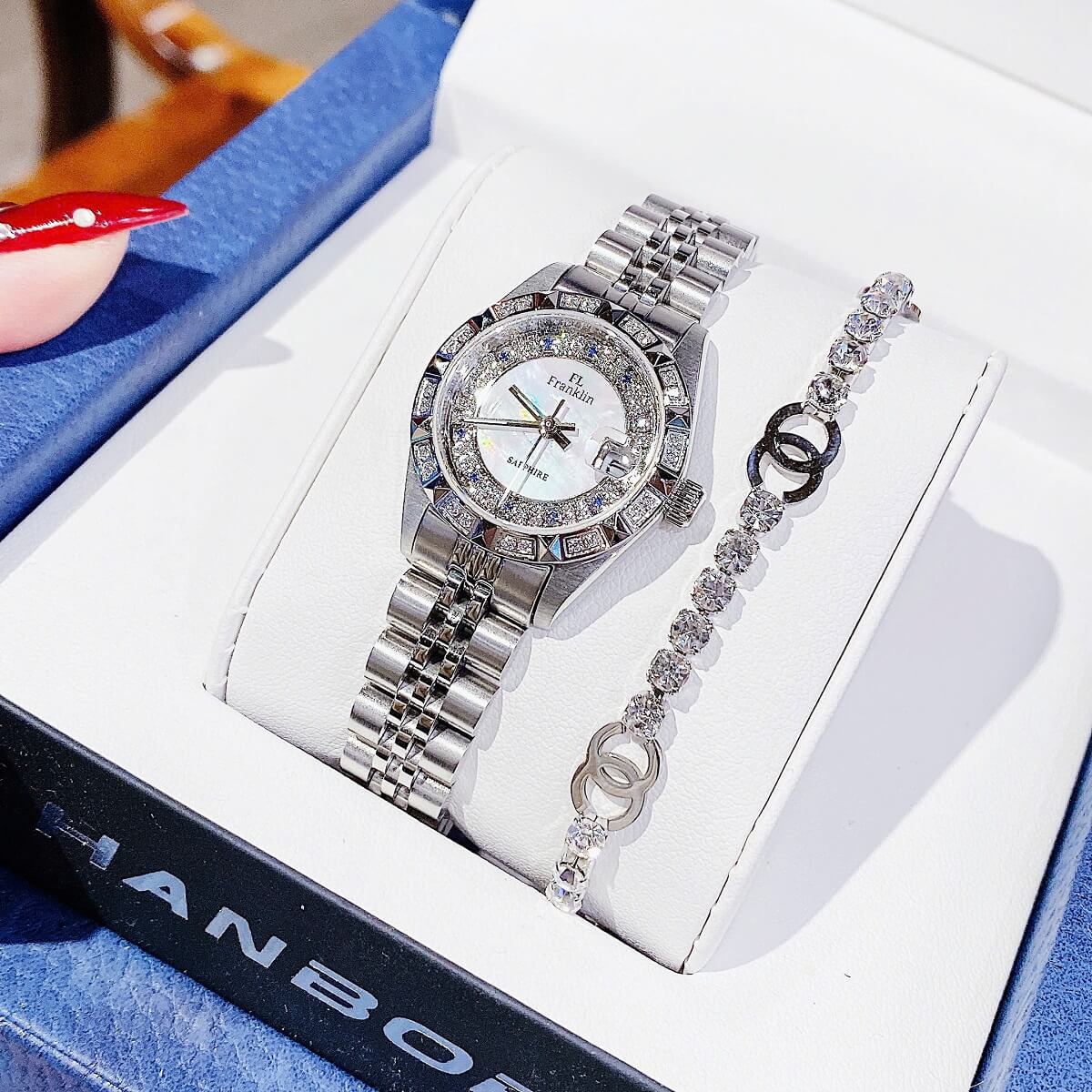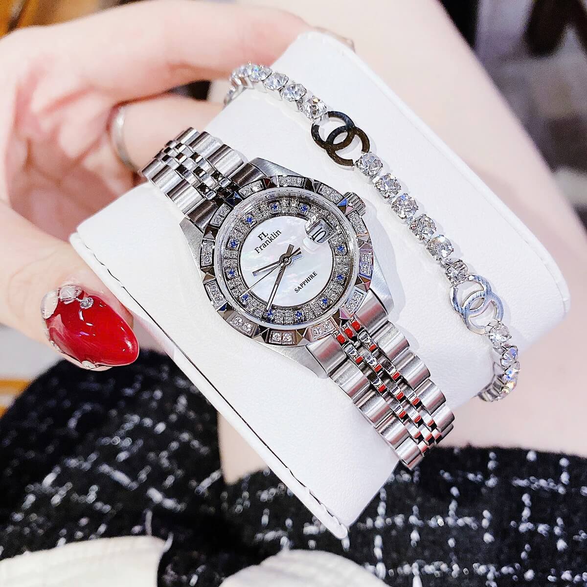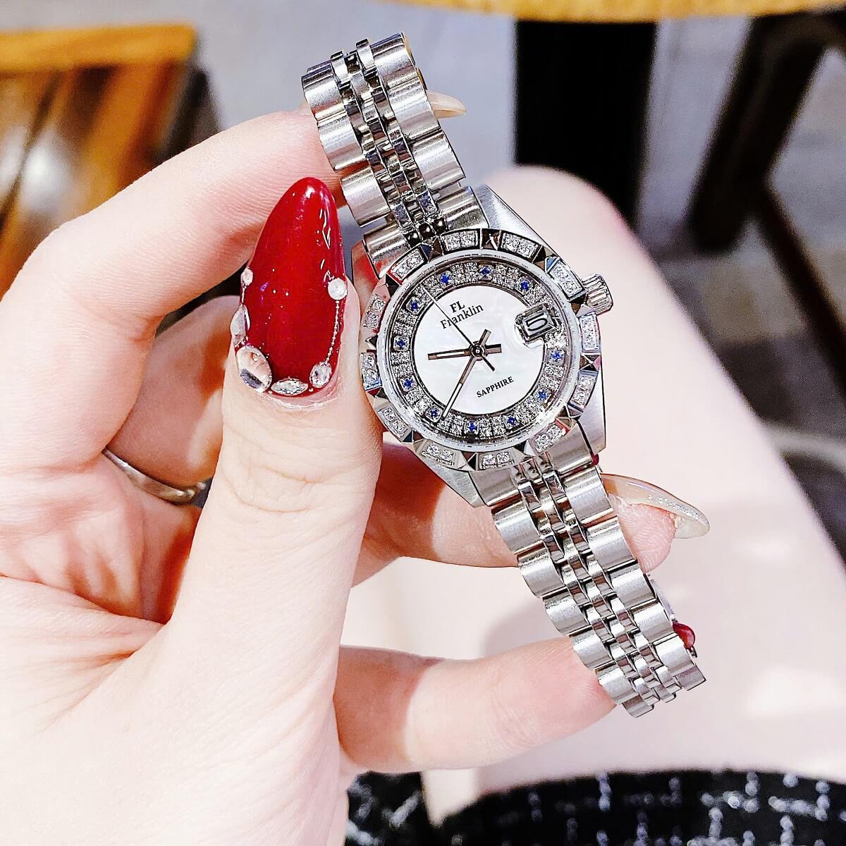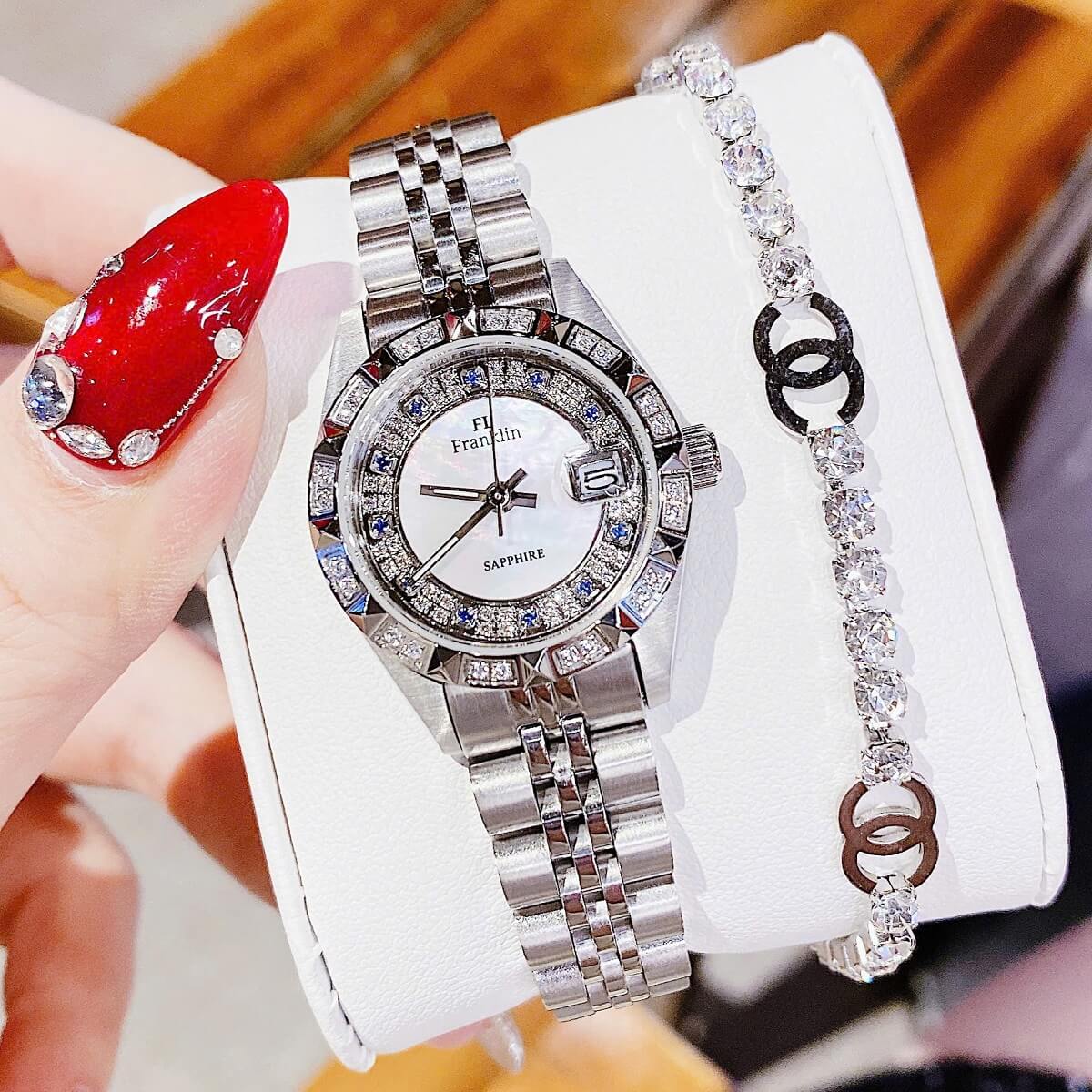 Đồng Hồ Nữ Franklin Dây Vỏ Inox Đính Đá Silver Size 26mm là một mẫu đồng hồ nữ sang trọng và tinh tế, phù hợp cho các quý cô yêu thích sự nhẹ nhàng và thanh lịch. Dưới đây là một số đặc điểm nổi bật của sản phẩm này: