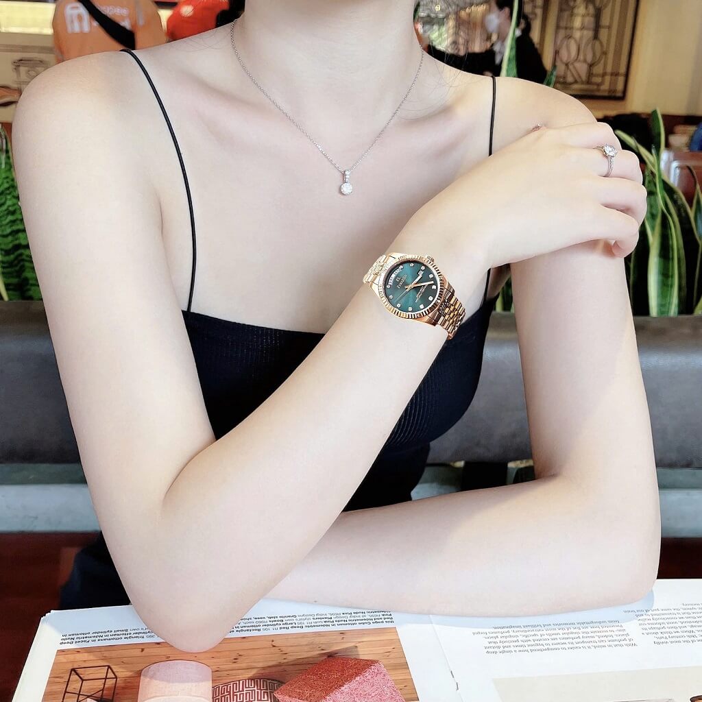 Mặt đồng hồ: Kích thước mặt đồng hồ là 32mm, phù hợp với cổ tay của nhiều người, tạo cảm giác nhẹ nhàng nhưng vẫn nổi bật.