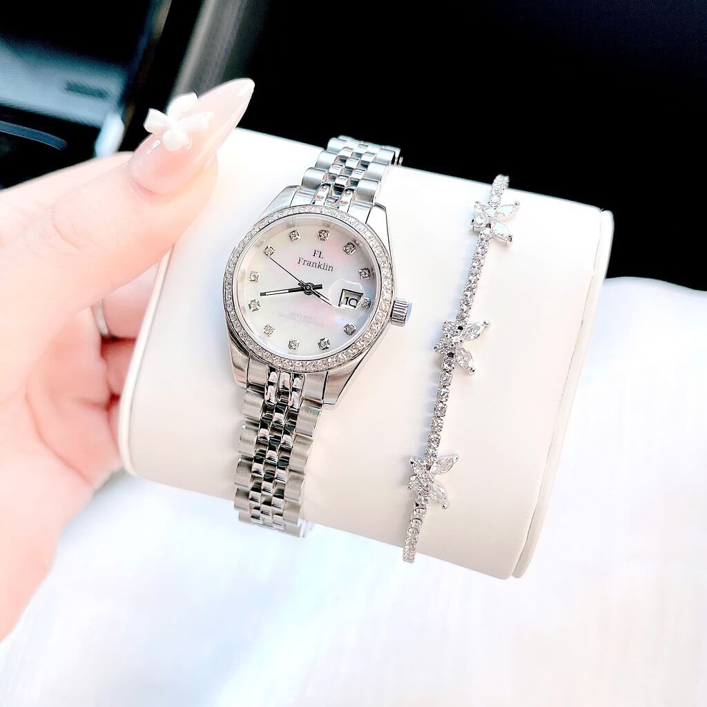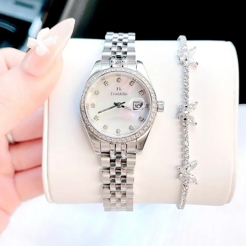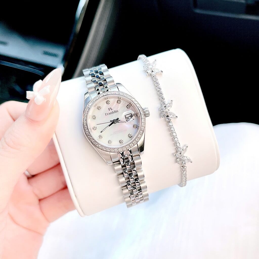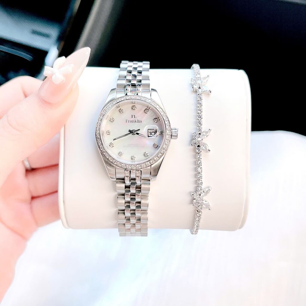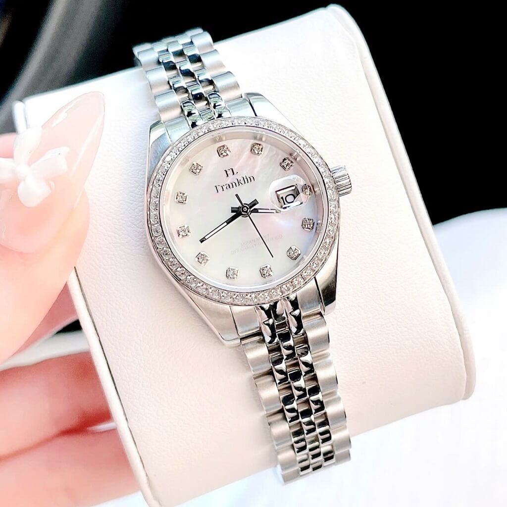 Thông số chi tiết sản phẩm: Đồng Hồ Nữ Franklin Dây Vỏ Inox Silver White Đính Đá Size 28mm Chính Hãng