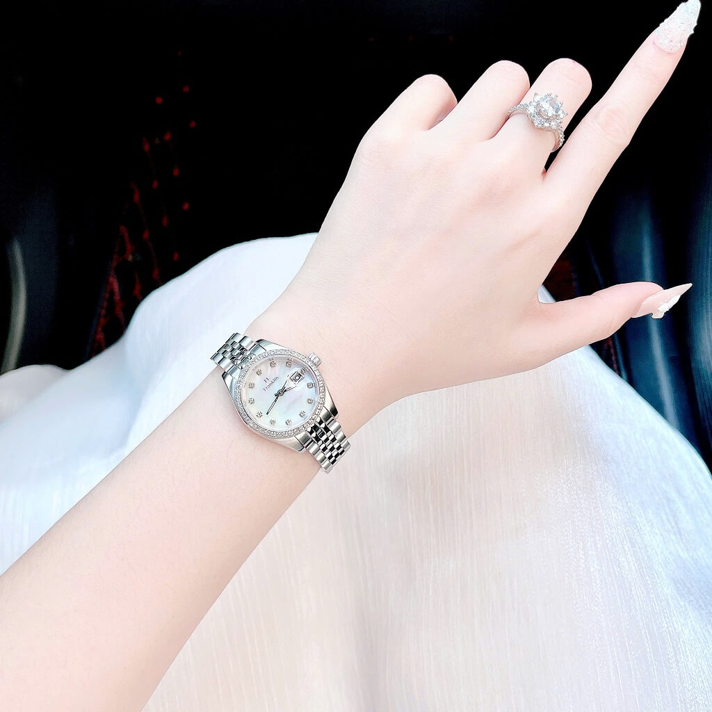 Mặt đồng hồ: Mặt đồng hồ màu trắng, trang bị các viên đá Swarovski hoặc đá nhân tạo làm điểm nhấn xung quanh viền đồng hồ, tạo sự lấp lánh và thêm phần nữ tính.