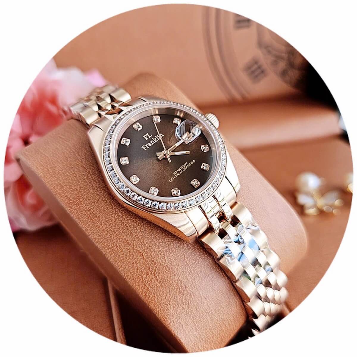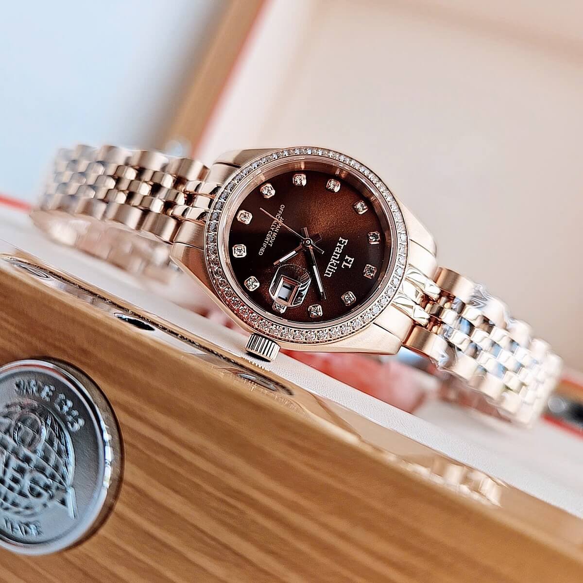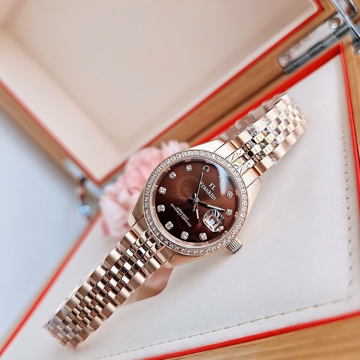 Màu mặt số: Nâu chocolate sang trọng, đính đá tinh tế