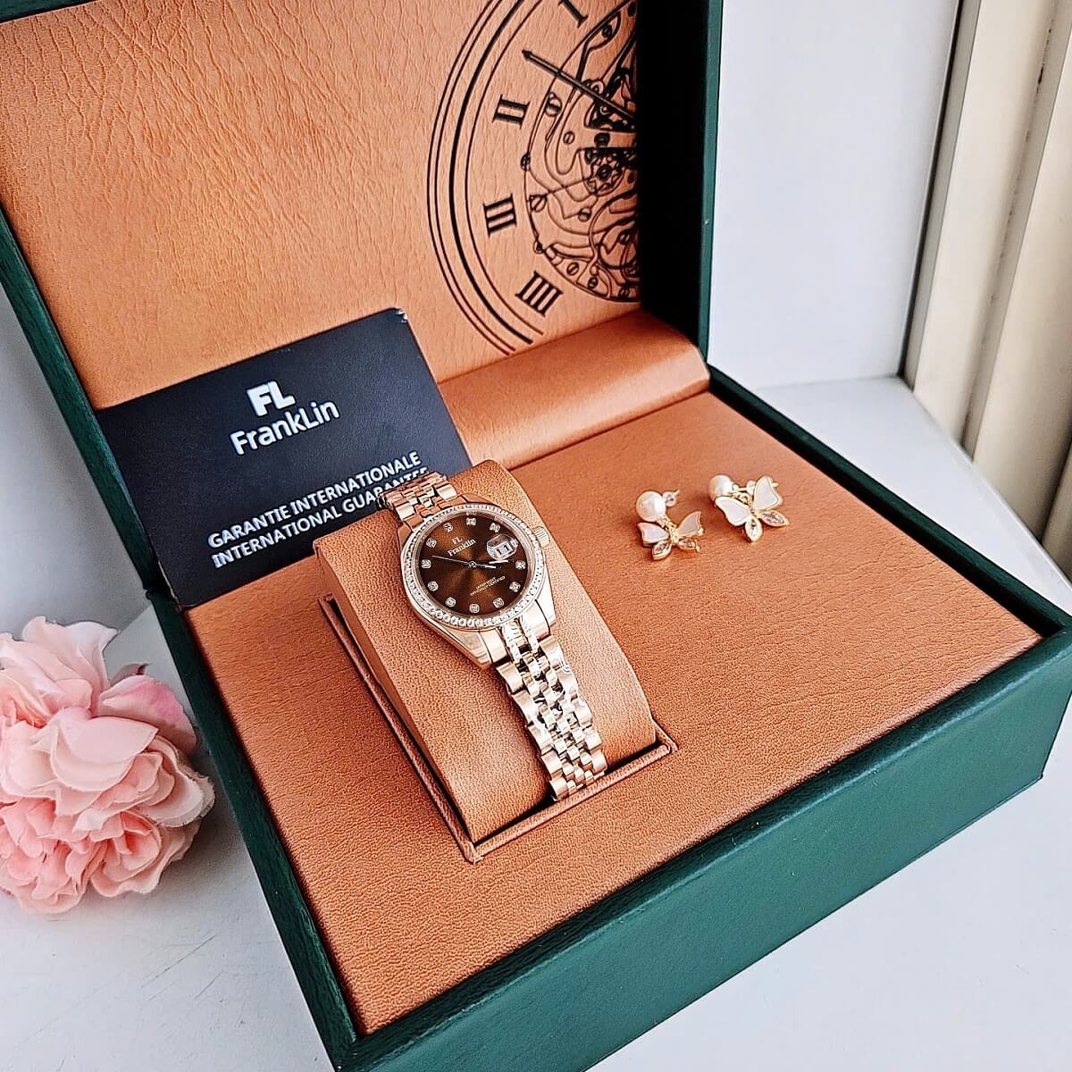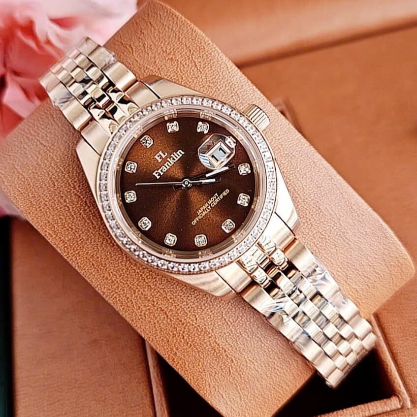 Franklin FL24910 là chiếc đồng hồ nữ mang phong cách sang trọng và tinh tế. Thiết kế mặt nâu độc đáo kết hợp viền vàng hồng đính đá lấp lánh, tạo nên vẻ ngoài thanh lịch nhưng vẫn đầy cuốn hút. Với size nhỏ gọn 28mm, mẫu đồng hồ này tôn vinh nét nữ tính và sự thanh mảnh trên cổ tay phái đẹp.