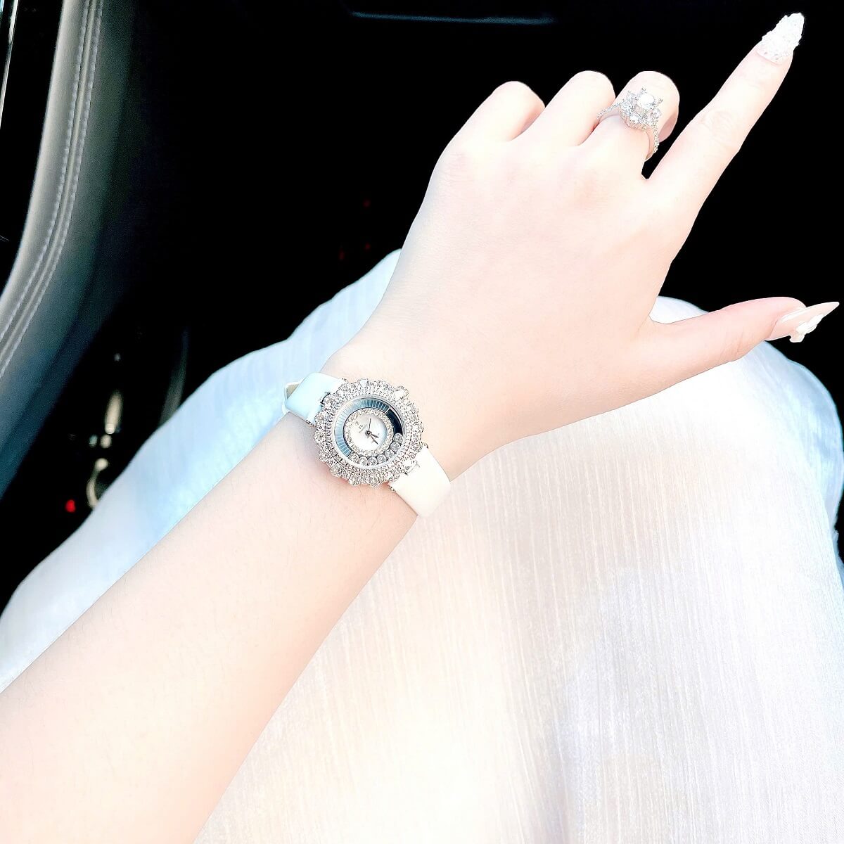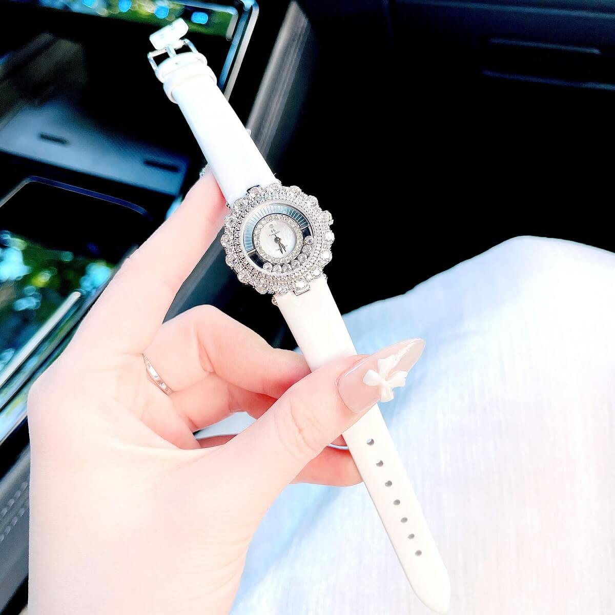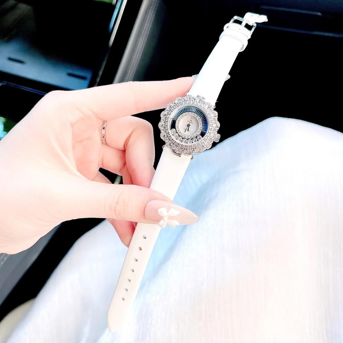 Dây đeo của đồng hồ là chất liệu da cao cấp, màu trắng nhẹ nhàng, tạo cảm giác mềm mại và dễ chịu khi đeo. Chất liệu dây da này không chỉ bền bỉ mà còn mang đến cảm giác thoải mái cho người sử dụng trong suốt cả ngày dài. Màu trắng của dây da kết hợp với vỏ đồng hồ màu bạc tạo nên một sự kết hợp hoàn hảo, làm nổi bật vẻ đẹp thanh thoát, tinh tế mà không kém phần sang trọng.