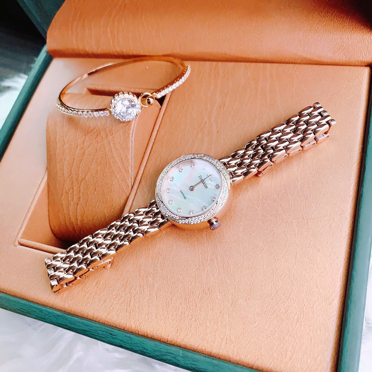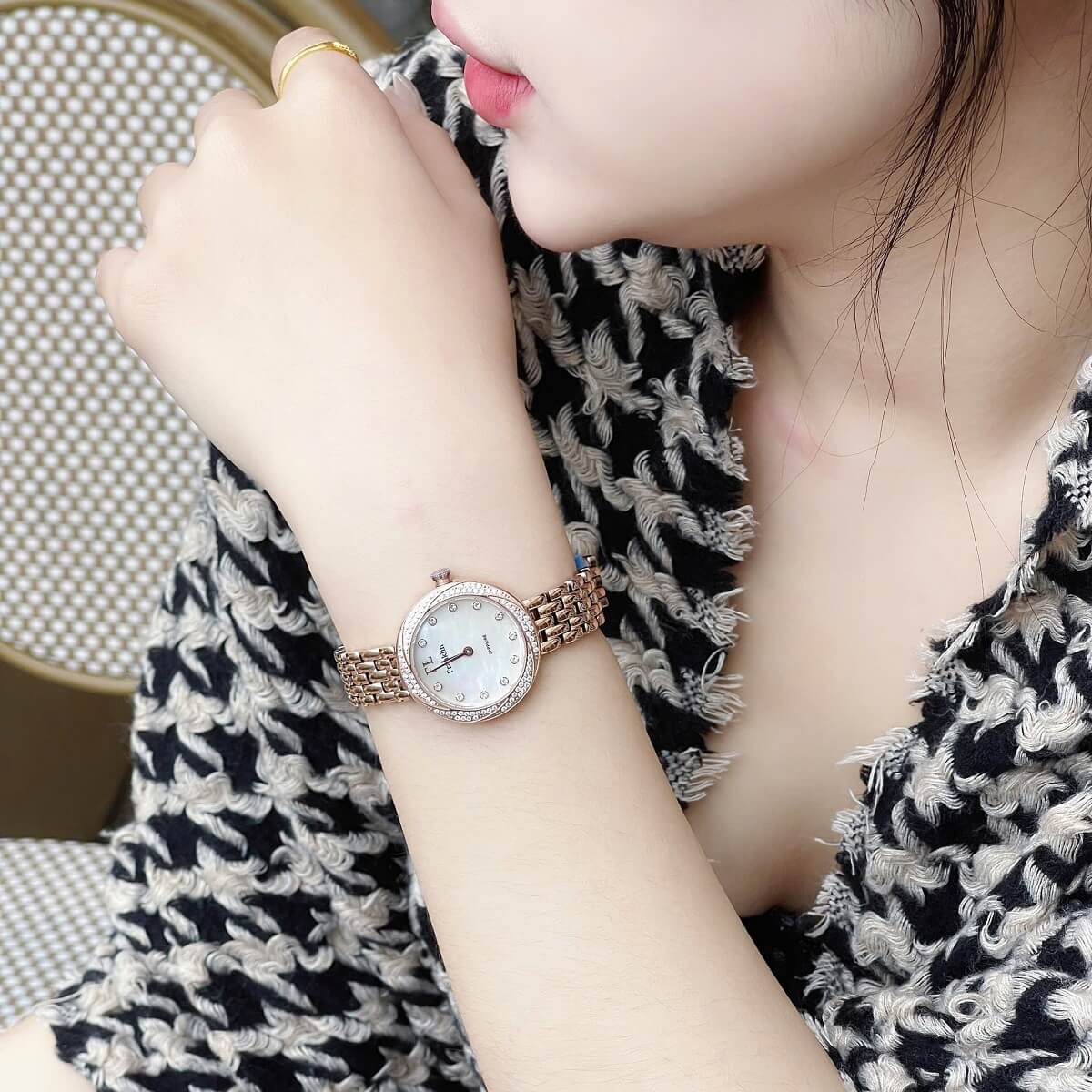 Một trong những điểm nhấn nổi bật của mẫu đồng hồ này chính là việc được đính những viên đá lấp lánh xung quanh mặt đồng hồ. Những viên đá này không chỉ làm tăng vẻ đẹp của chiếc đồng hồ mà còn mang đến một sự sang trọng và quý phái. Những viên đá nhỏ xinh tạo thành một vòng tròn tinh tế, khiến chiếc đồng hồ thêm phần cuốn hút và dễ dàng thu hút mọi ánh nhìn.