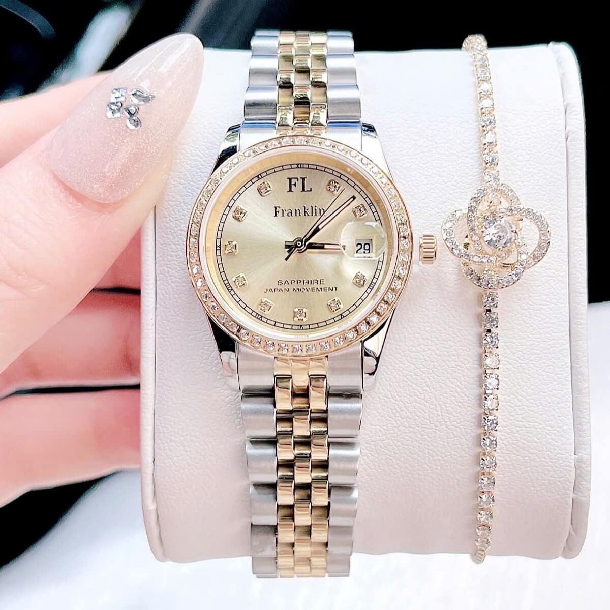 Đồng hồ nữ Franklin FL4412 Dây Vỏ Inox Demi Gold Đính Đá Size 28mm Chính Hãng là một trong những mẫu đồng hồ nổi bật trong bộ sưu tập của thương hiệu Franklin, với thiết kế tinh tế, sang trọng, và phù hợp cho nhiều dịp khác nhau. Dưới đây là những đặc điểm chi tiết hơn về chiếc đồng hồ này: