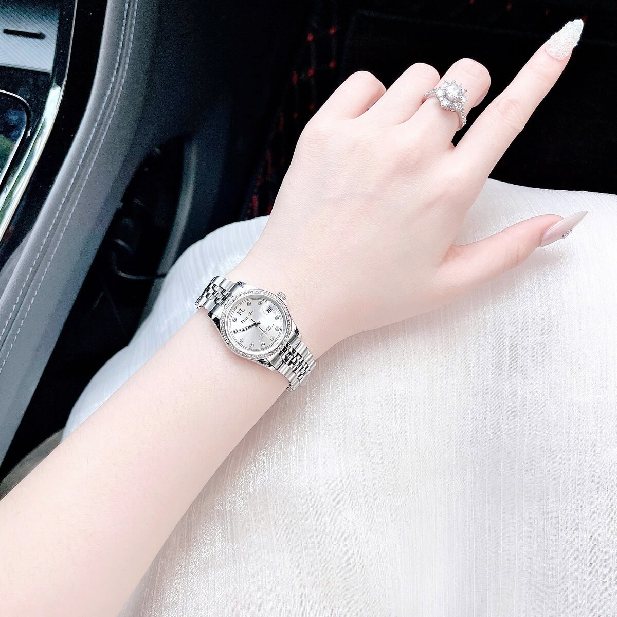 Điểm đáng chú ý đầu tiên của chiếc đồng hồ này chính là thiết kế mặt đồng hồ nhỏ gọn, với đường kính 28mm, cực kỳ phù hợp với những cô gái có cổ tay nhỏ, mang đến vẻ đẹp nữ tính, thanh thoát. Mặt đồng hồ được làm từ kính cường lực, có độ bền cao, bảo vệ đồng hồ khỏi những tác động mạnh từ bên ngoài.