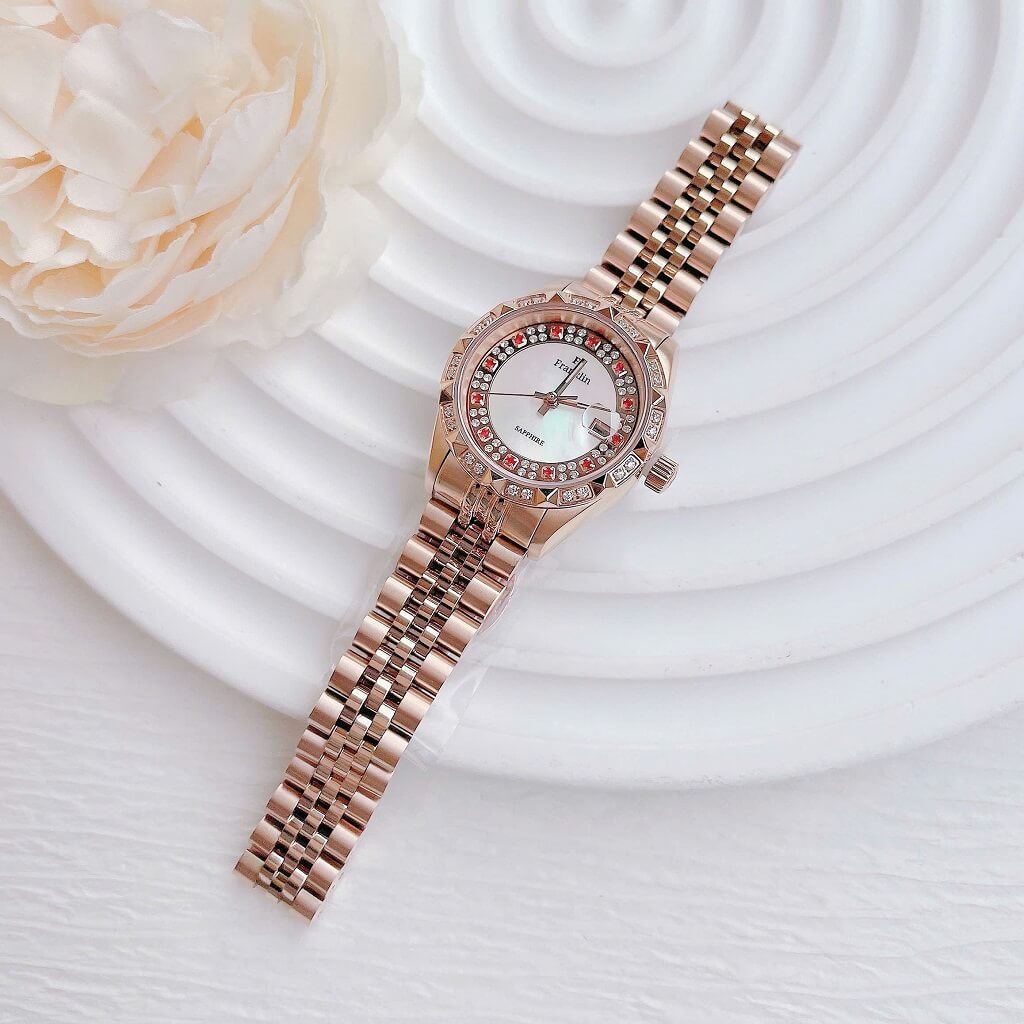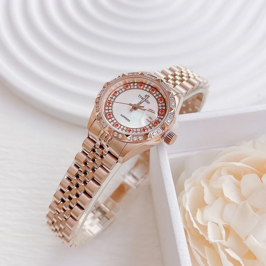 Nếu bạn đang tìm kiếm một chiếc đồng hồ nữ cao cấp, tinh tế và nổi bật trong từng chi tiết, thì Franklin FL8686 chính là sự lựa chọn hoàn hảo. Sở hữu thiết kế mặt xà cừ tự nhiên kết hợp cùng vỏ rose gold đính đá lấp lánh, mẫu đồng hồ này mang đến vẻ đẹp thanh lịch và cuốn hút, phù hợp với mọi phong cách – từ công sở cho đến dạo phố hay sự kiện sang trọng.