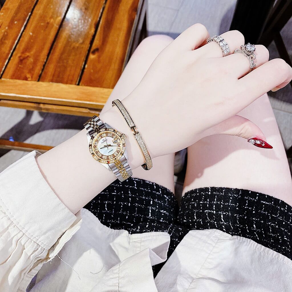 Phần viền đồng hồ được đính đá tinh xảo, tăng thêm phần lấp lánh và nữ tính. Màu demi gold (vàng phối ánh kim) thời thượng tạo cảm giác cao cấp, dễ phối với trang phục công sở, dạ tiệc hay cả phong cách thường ngày.