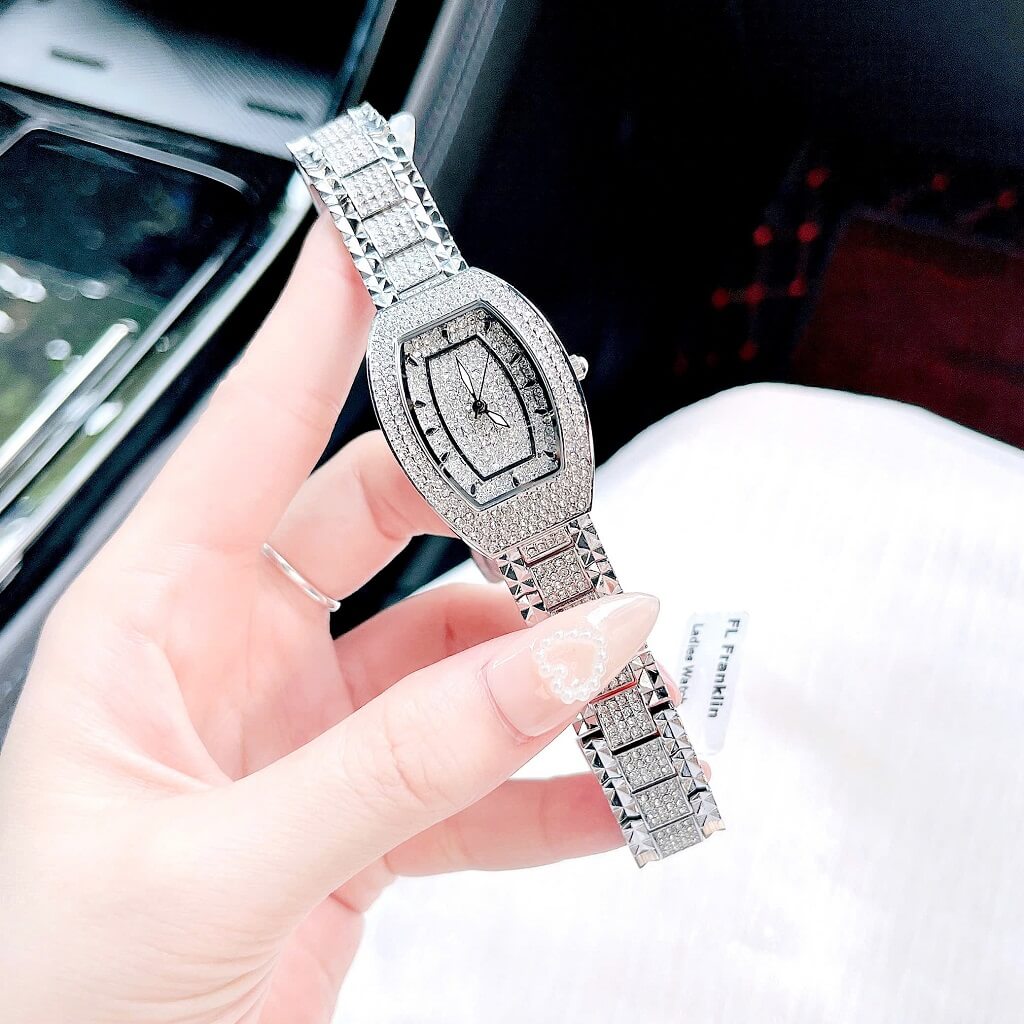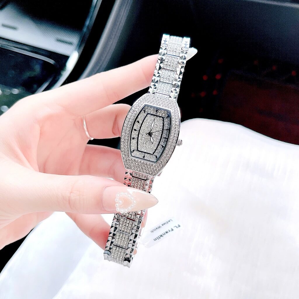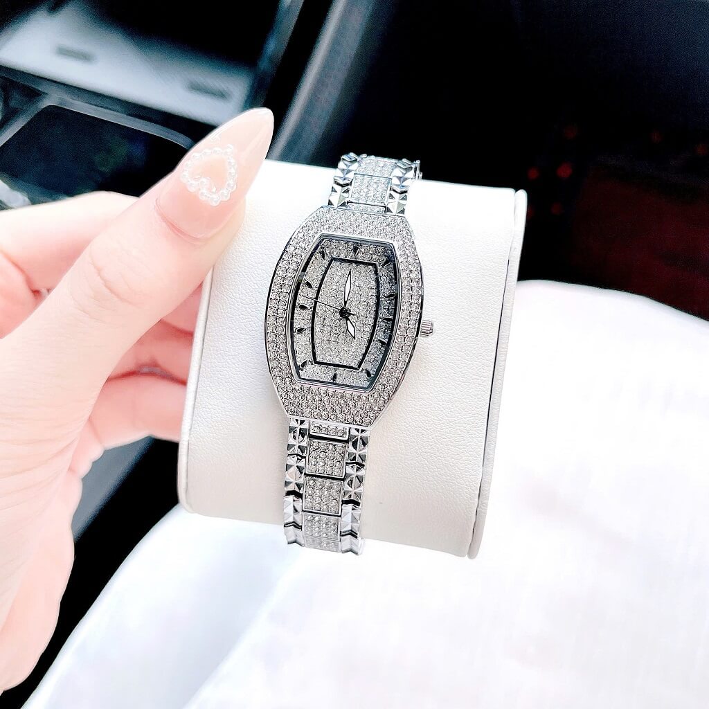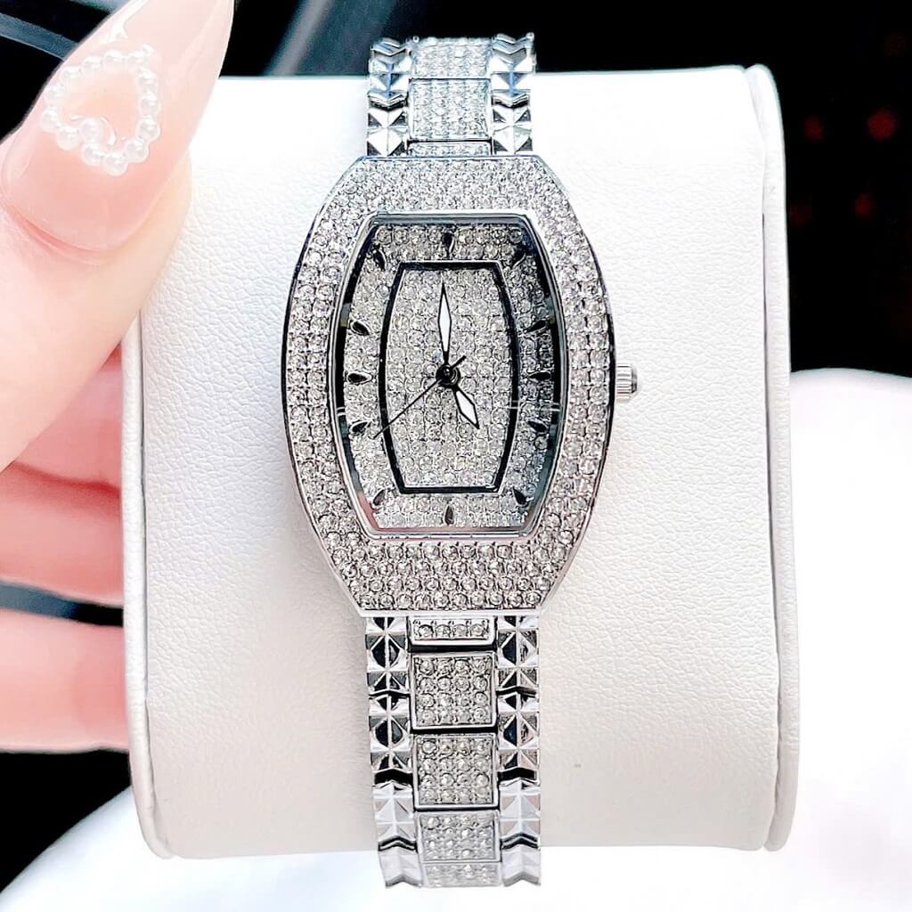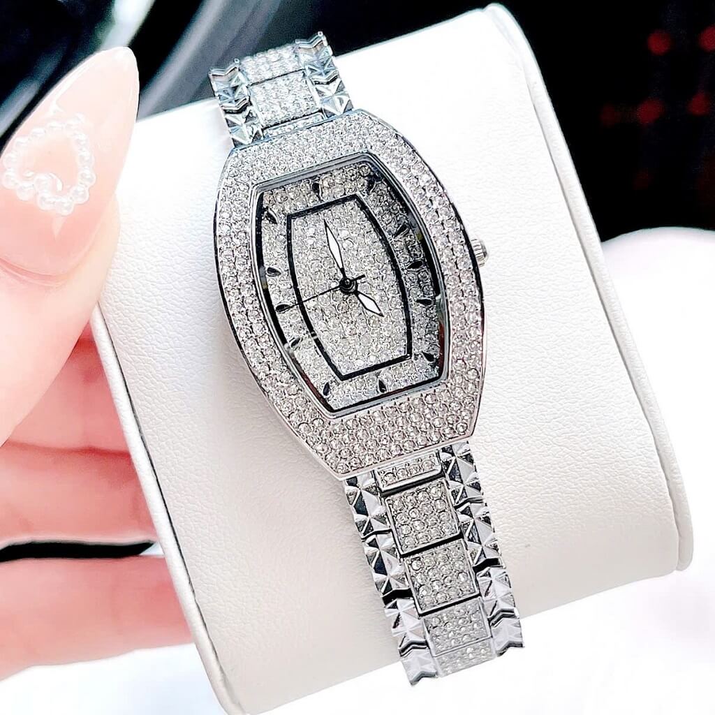Đính đá: Mặt đồng hồ được trang trí với những viên đá lấp lánh, tạo điểm nhấn nổi bật và thêm phần quý phái cho người đeo. Các viên đá này thường được bố trí xung quanh mặt đồng hồ hoặc trên các chi tiết khác.