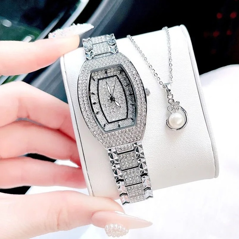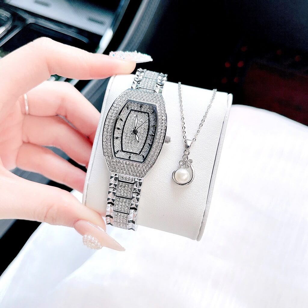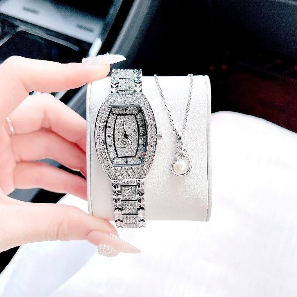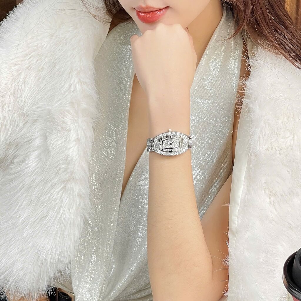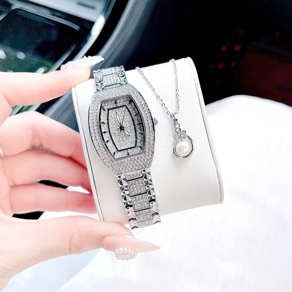 Đính đá: Mặt đồng hồ được trang trí với những viên đá lấp lánh, tạo điểm nhấn nổi bật và thêm phần quý phái cho người đeo. Các viên đá này thường được bố trí xung quanh mặt đồng hồ hoặc trên các chi tiết khác.