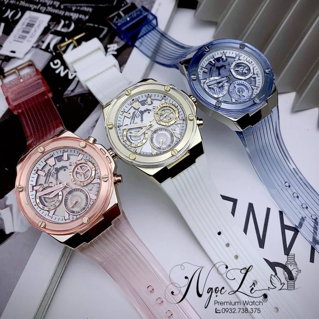 Size mặt 39mm, unisex dành cho nữ tay to, Guess nữ fom dáng Hublot sang trọng