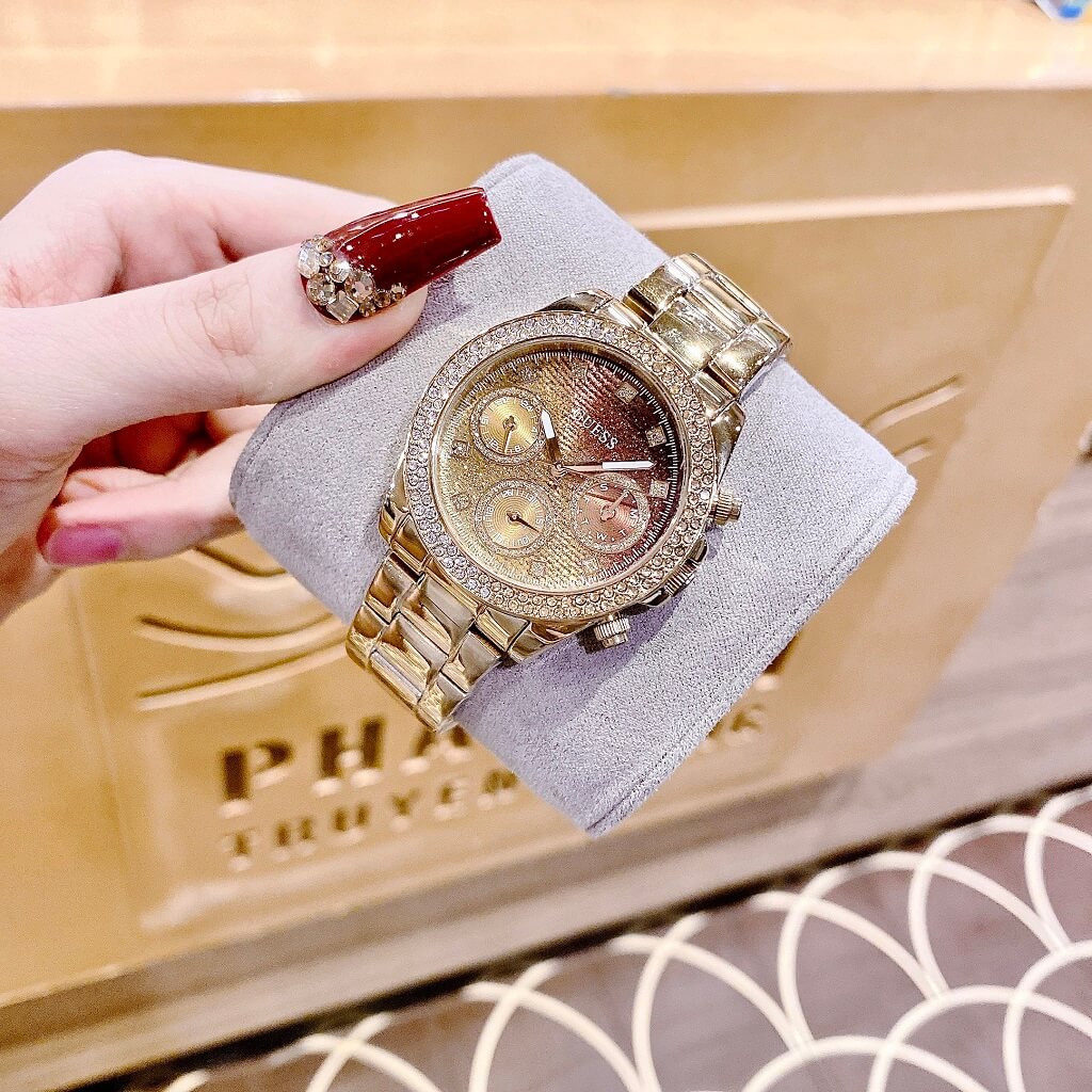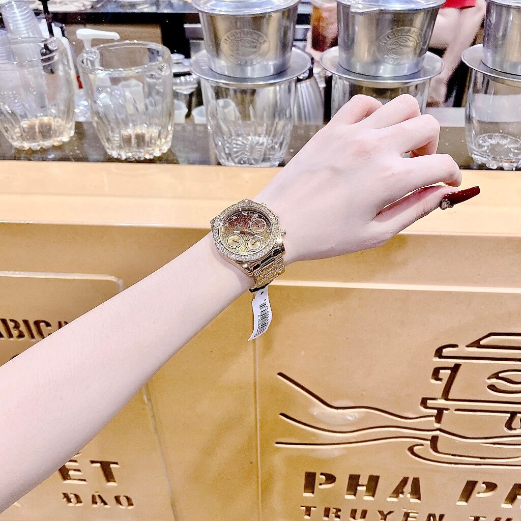 - Size mặt 38mm, mặt số đính đá lấp lánh chạy 6 kim