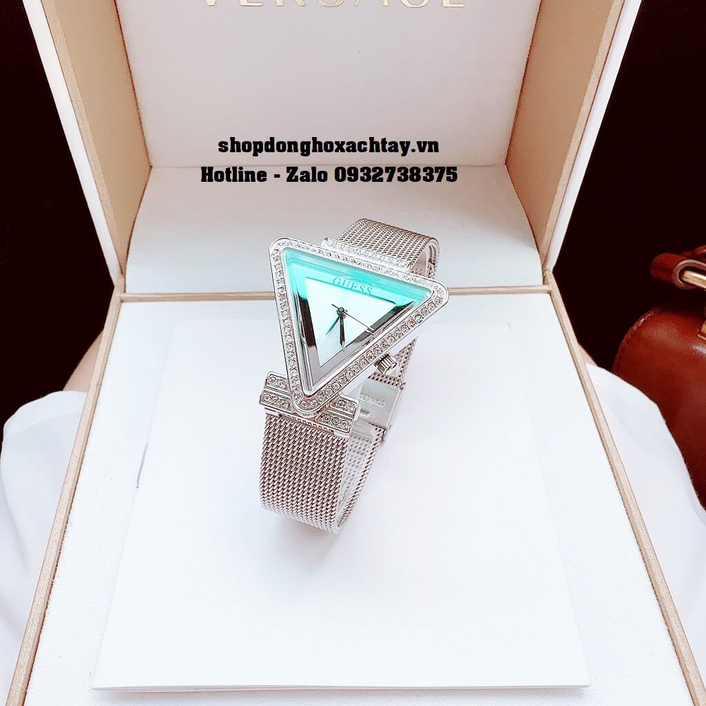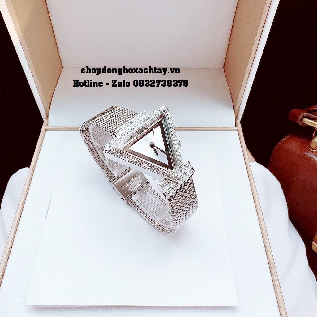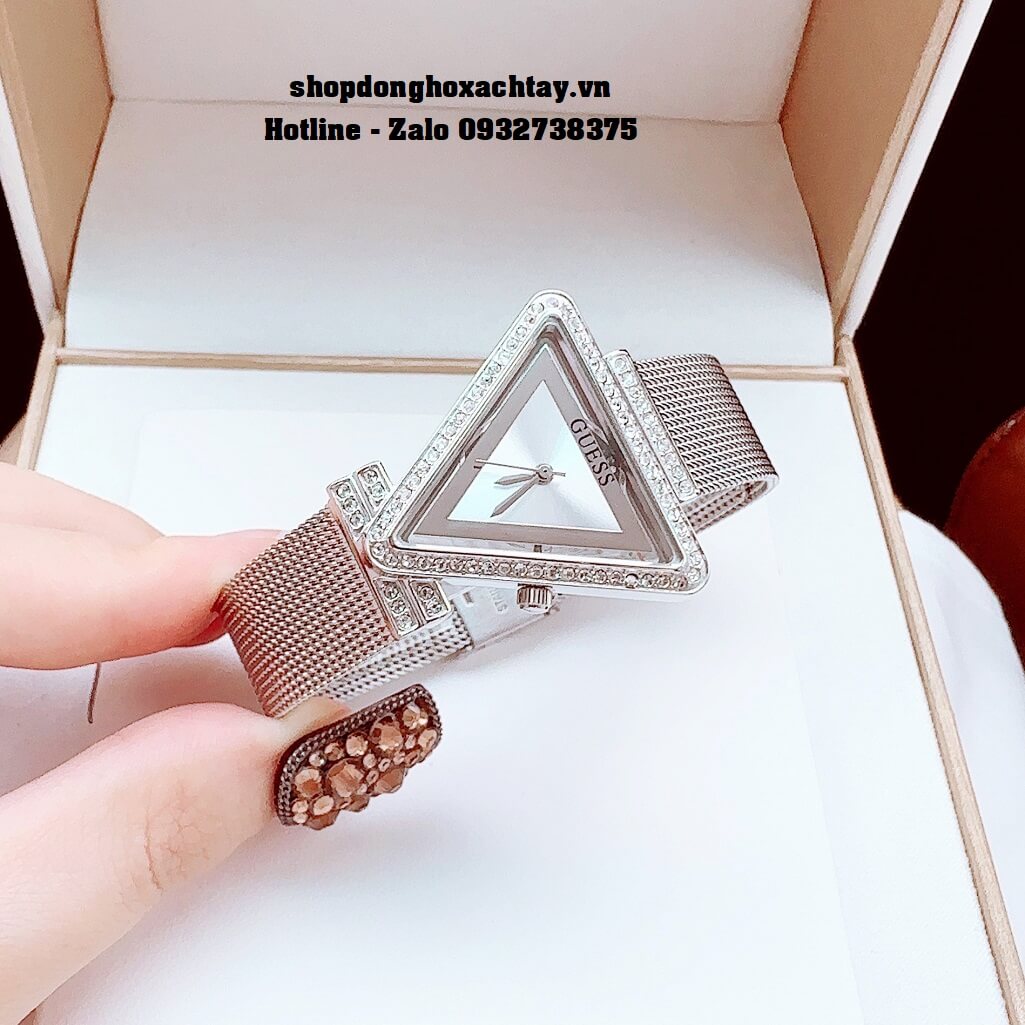 - Mẫu mới và đặc biệt nhất của hãng Guess với thiết kế mặt hình tam giác, viền mặt được đính đá Swarovski sáng tựa kim cương