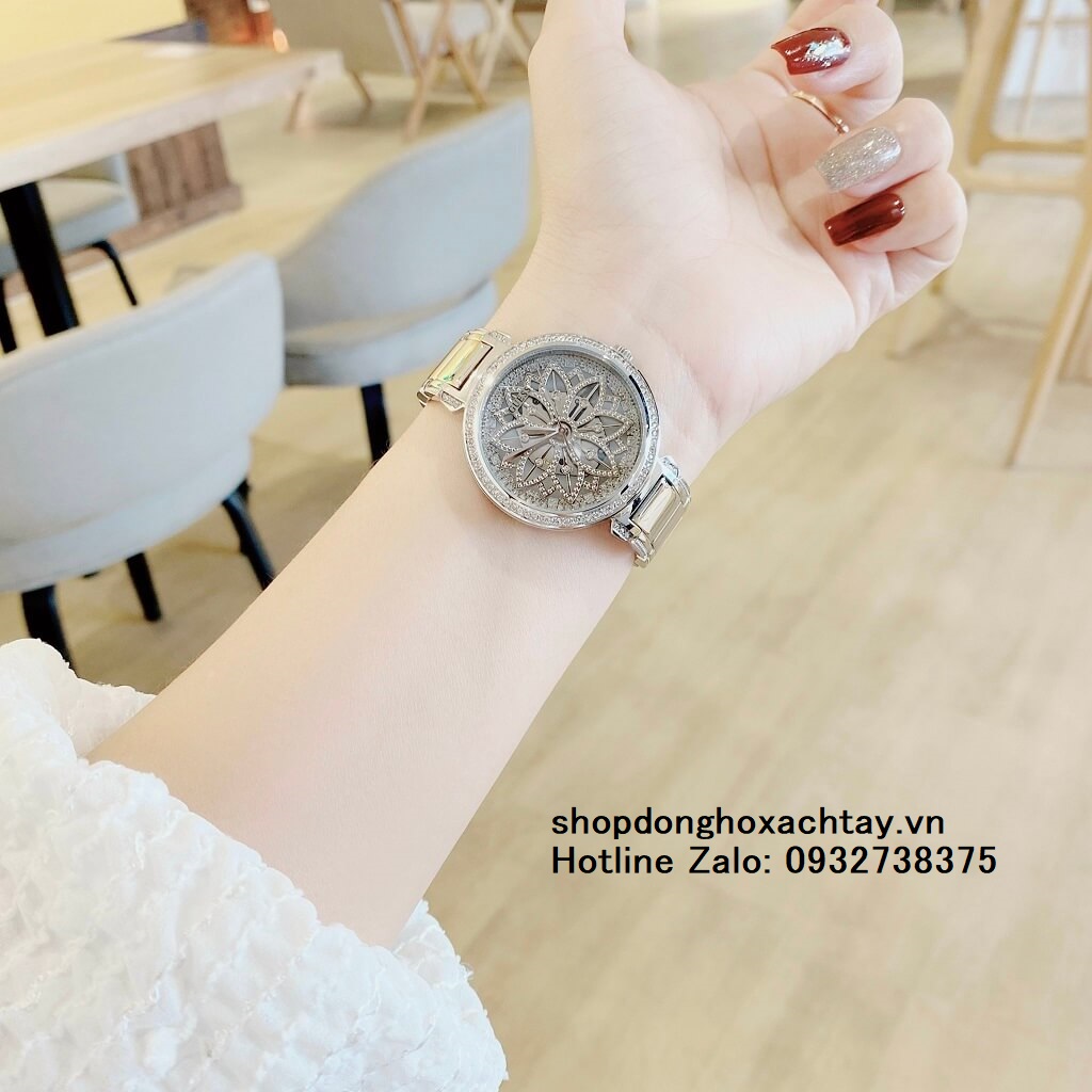 Viền và mặt đồng hồ đính đá nổi bật, mặt in 3D bông hoa Lily trắng lấp lánh, đẹp kiêu sa