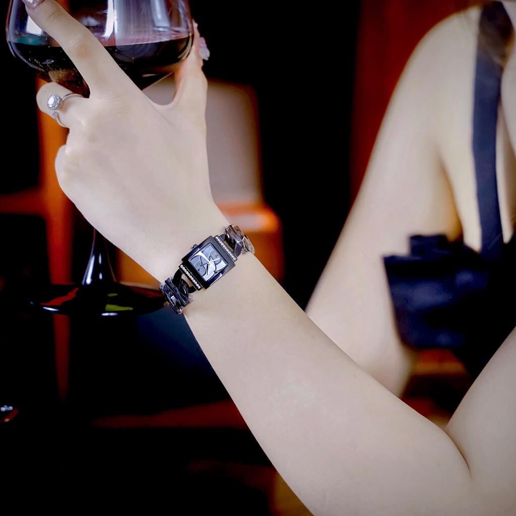 - Size 20.8mm nhỏ nhắn với dây inox mạ full đen kiểu dáng lắc tay xinh xắn
